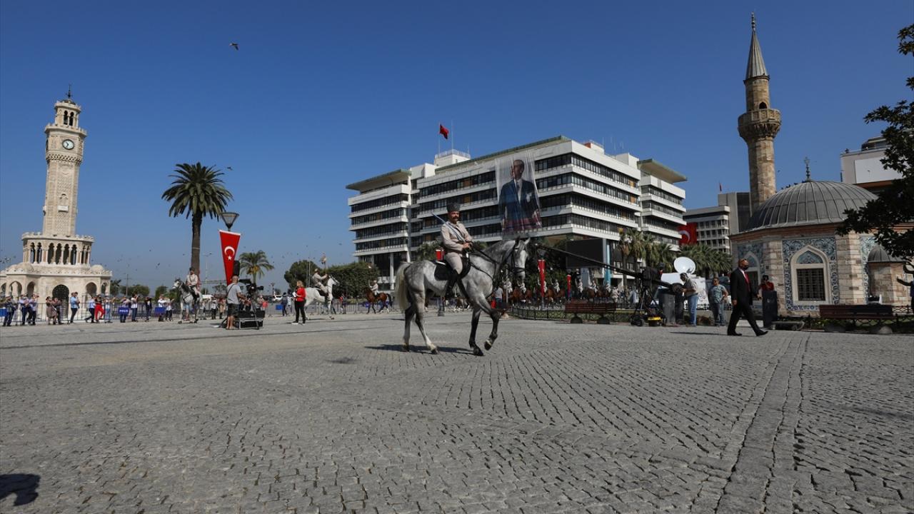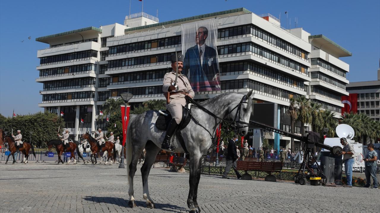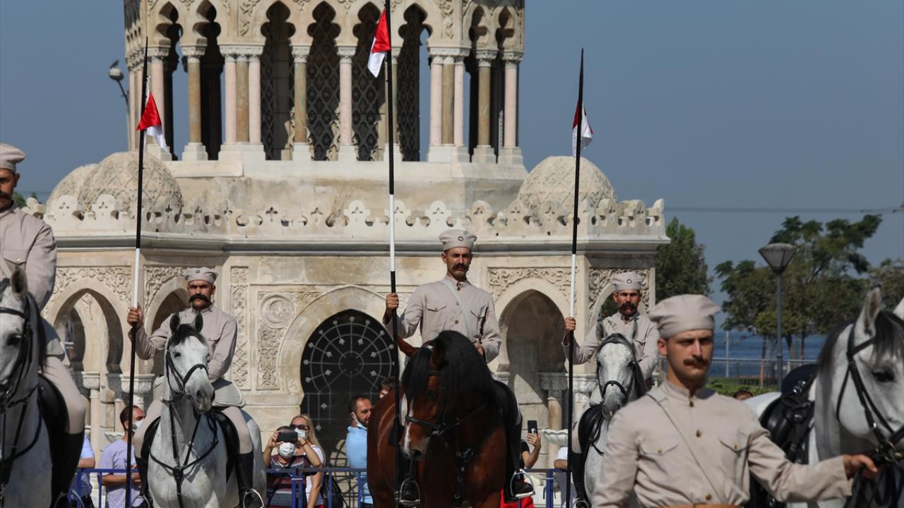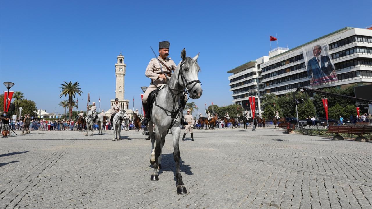 İzmir`in düşman işgalinden kurtuluşunun 99. yıl dönümü dolayısıyla düzenlenen tören kapsamında, İzmir Valiliği önünde atlı süvari birliklerinin kente girişi canlandırıldı.