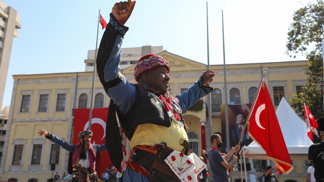 Törenin ardından, içlerinde bir Afrotürk de bulunan bir grup Konak Meydanı`nda zeybek oynadı.