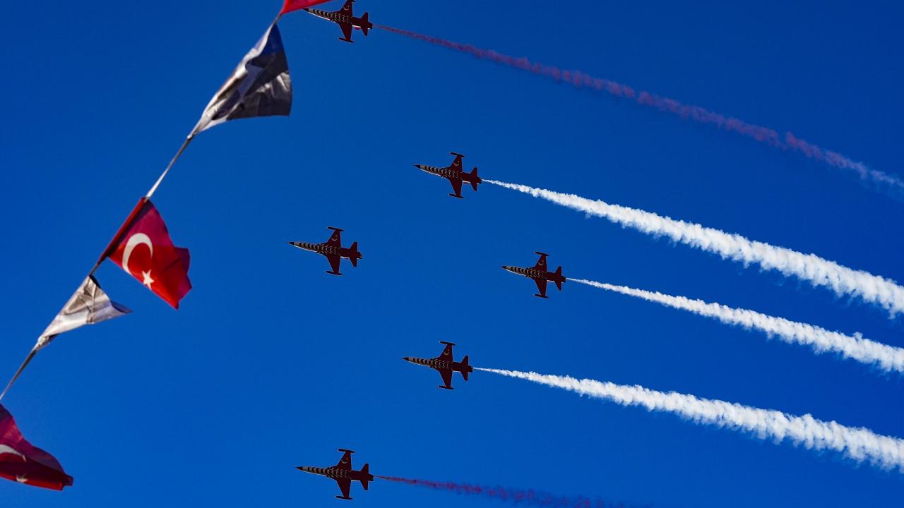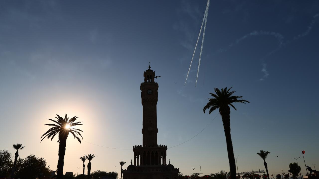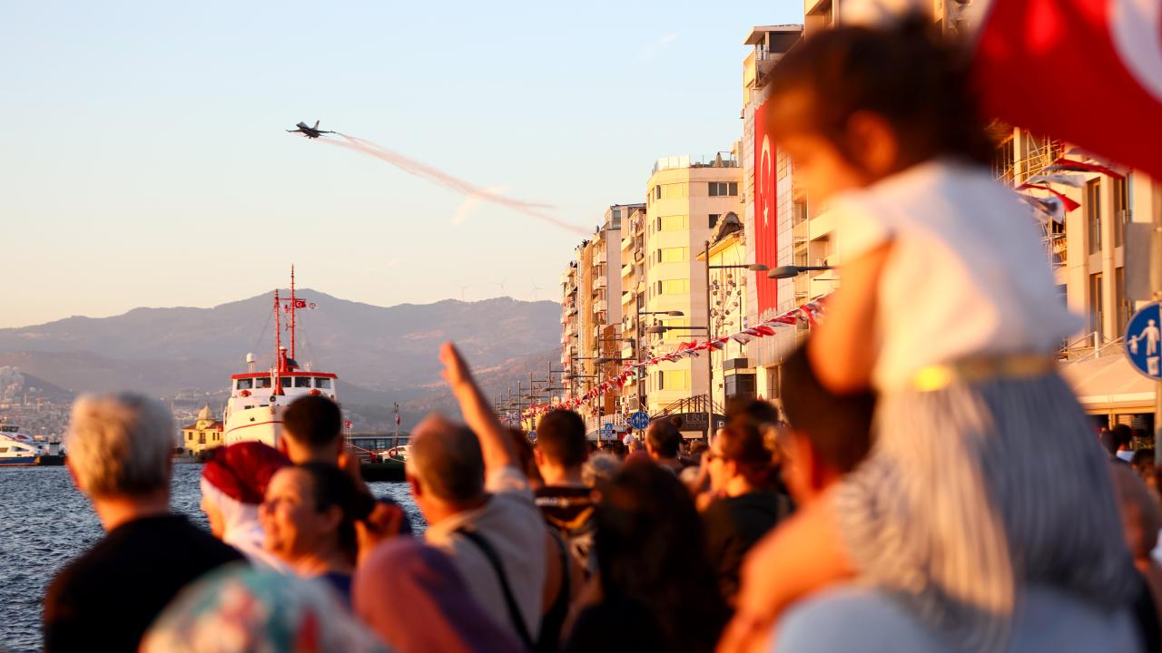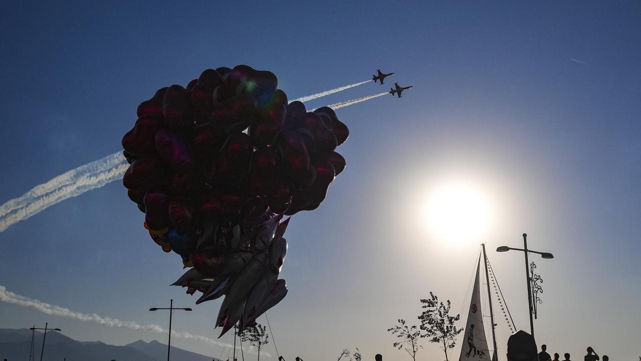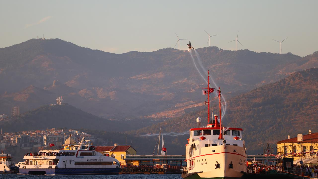 Türk Hava Kuvvetlerinin akrobasi timi Türk Yıldızları ile SOLOTÜRK, İzmir'in düşman işgalinden kurtuluşunun 103. yıl dönümü dolayısıyla hava gösterisi yaptı.