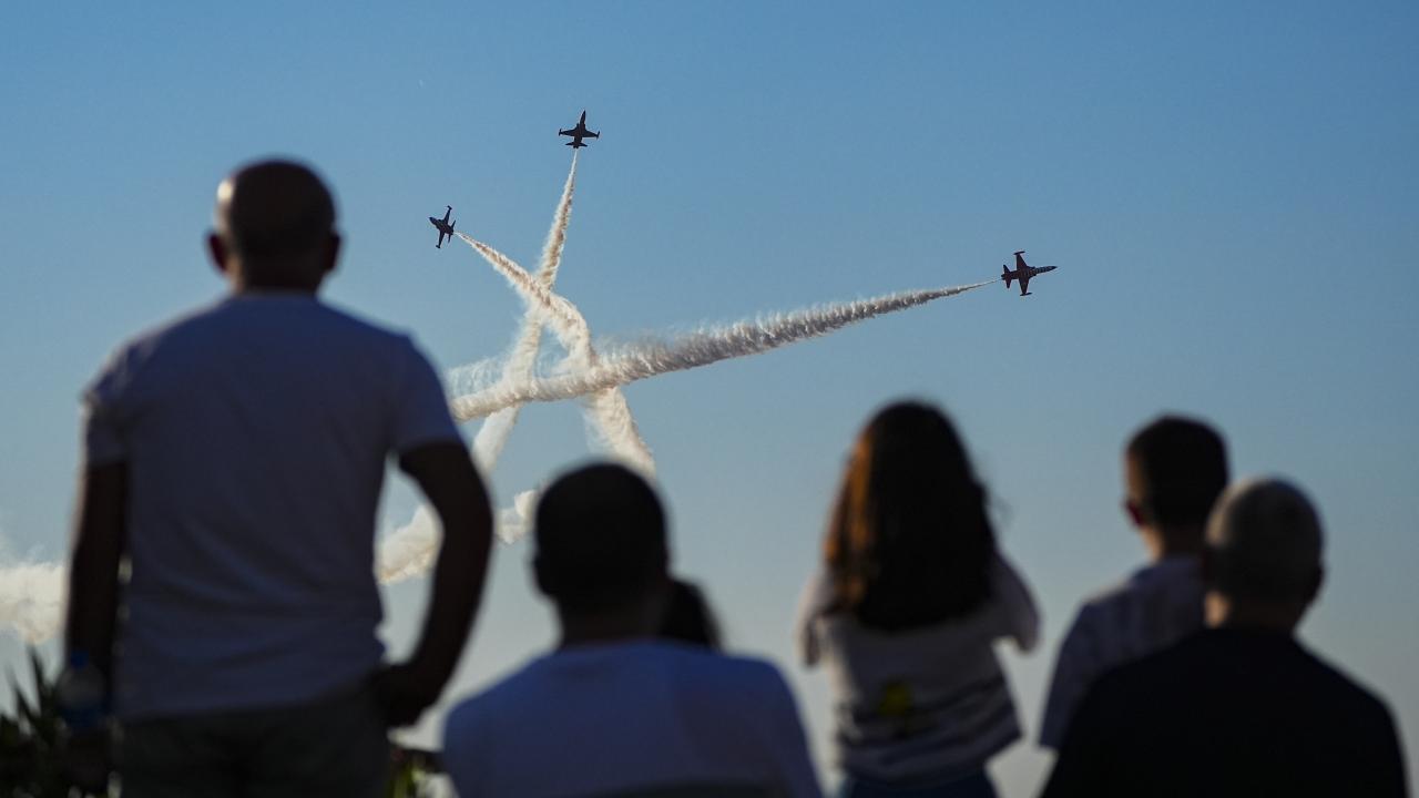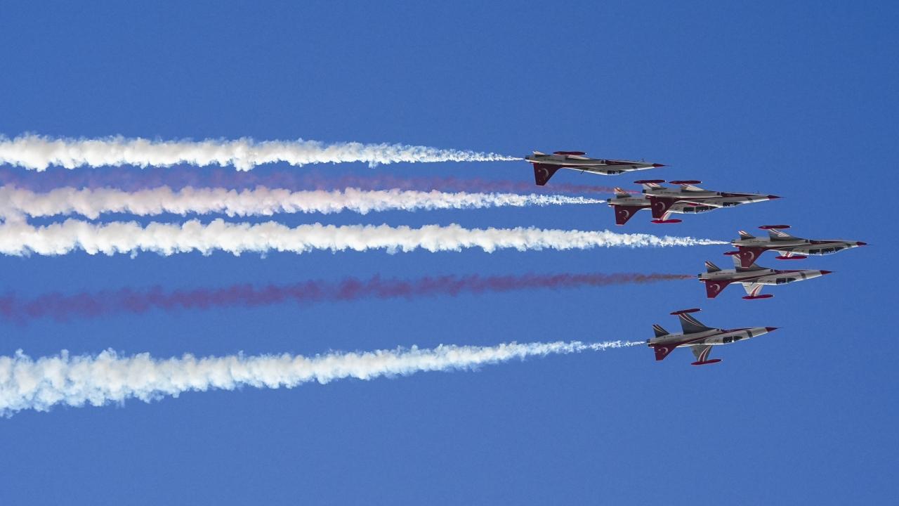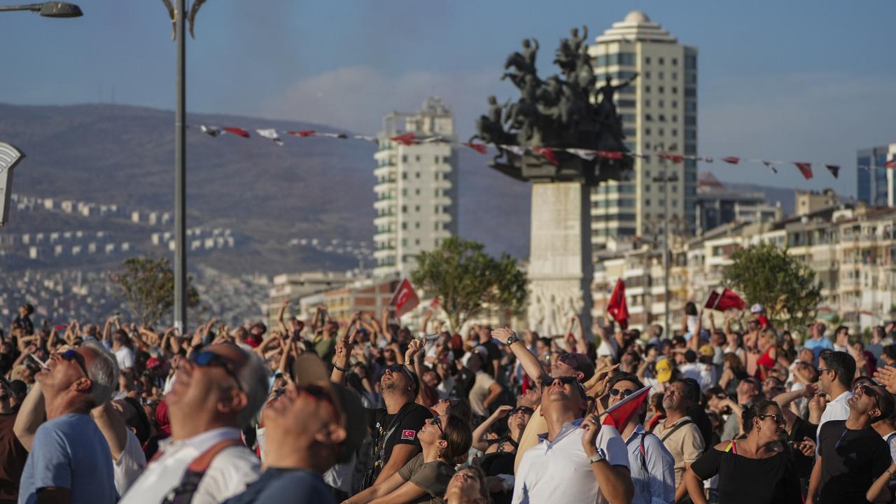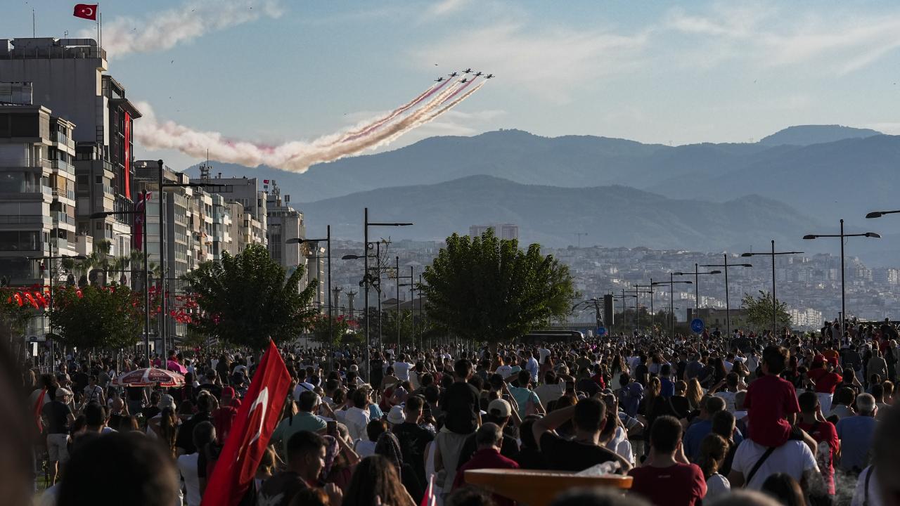 Türk Hava Kuvvetlerinin akrobasi timi Türk Yıldızları ile SOLOTÜRK, İzmir'in düşman işgalinden kurtuluşunun 103. yıl dönümü dolayısıyla hava gösterisi yaptı.