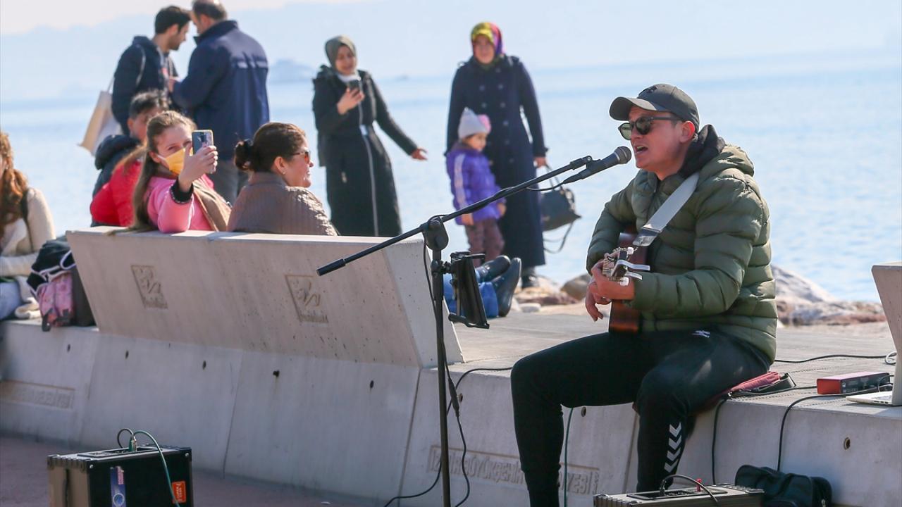Yoğunluğun en fazla gözlemlendiği noktalardan Karşıyaka ilçesindeki Bostanlı Sahili`nde sokak sanatçıları seslendirdikleri şarkılarla alandakilere adeta açık hava konseri sundu.