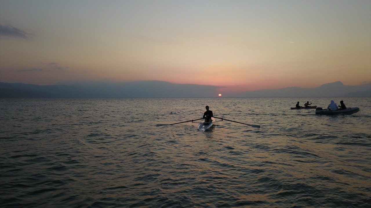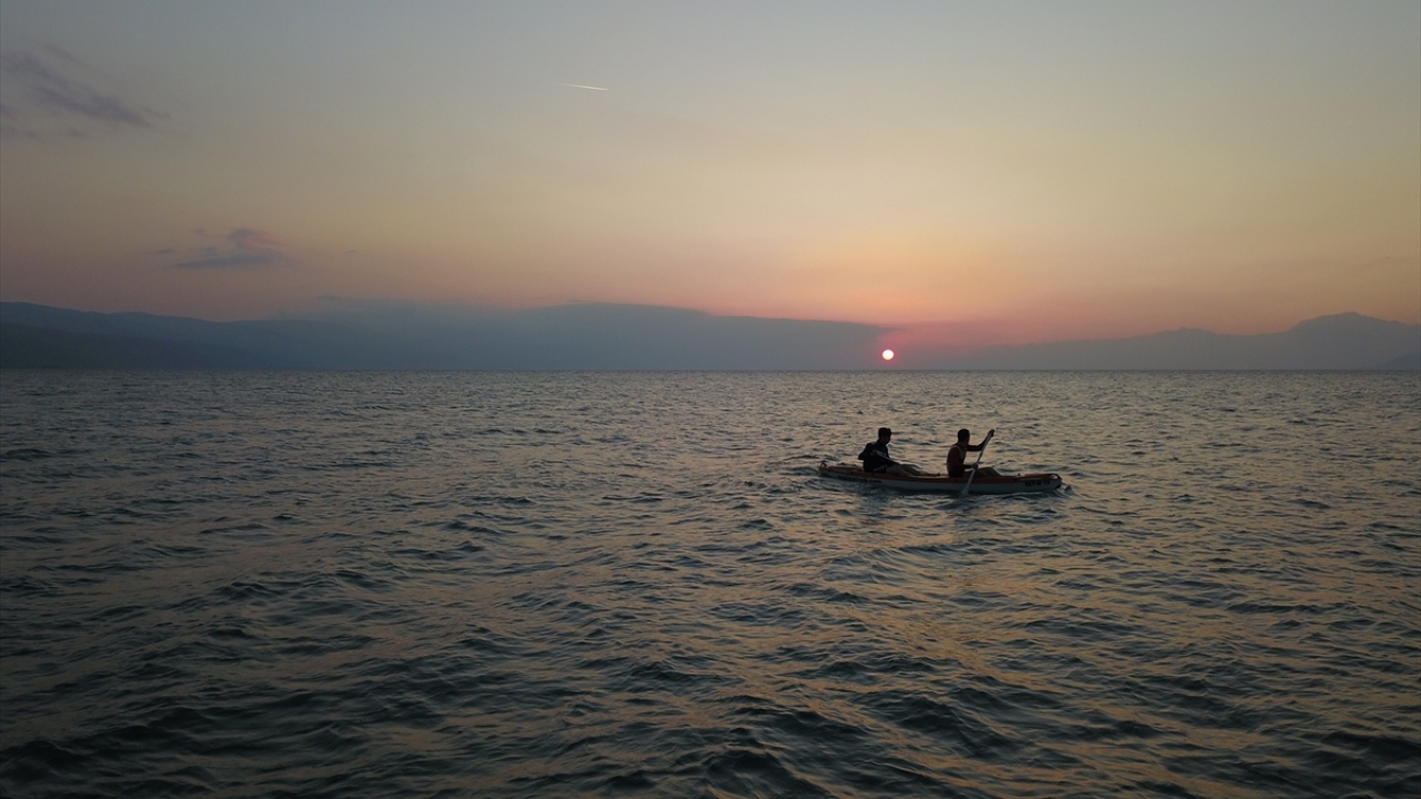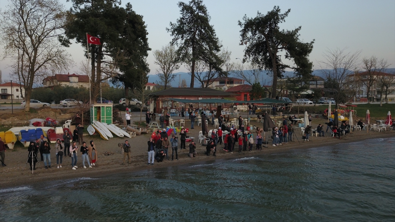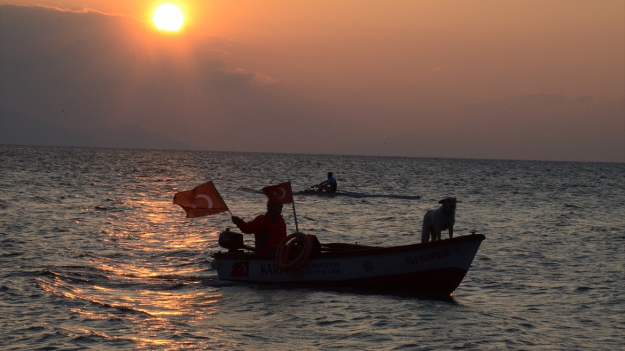 Fotoğrafçılar ise Türkiye`nin 5`inci büyük gölü olan İznik Gölü`nde, Güneş`in suya kavuştuğu anı yakalayabilmek için birbirleriyle yarıştı.