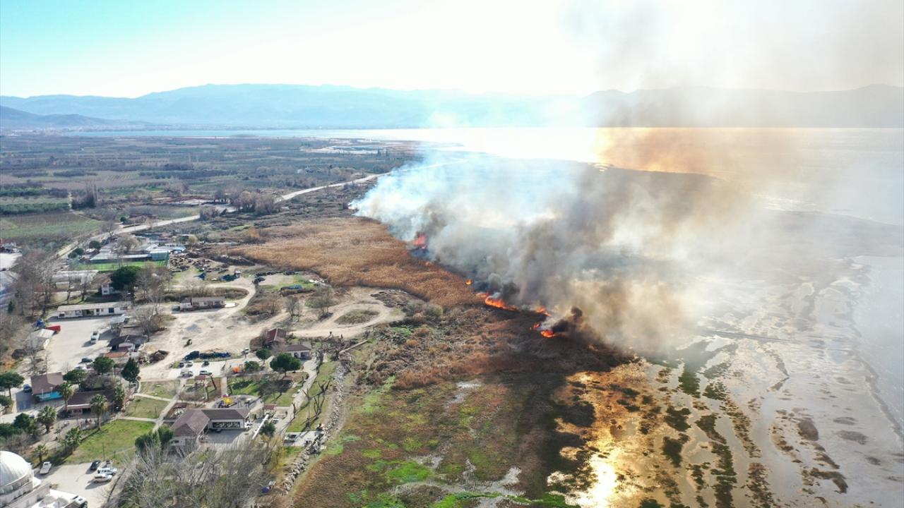 Bursa'nın İznik ilçesinde göl kıyısındaki sazlık alanda çıkan yangına müdahale ediliyor.