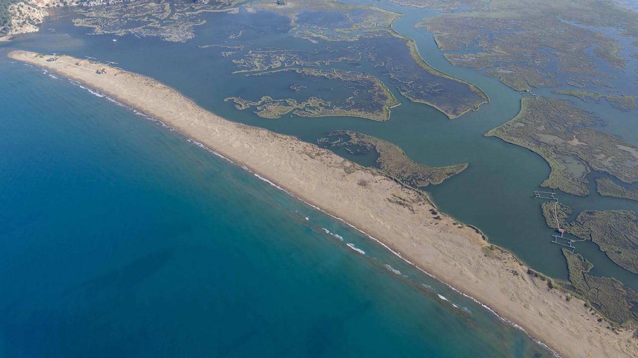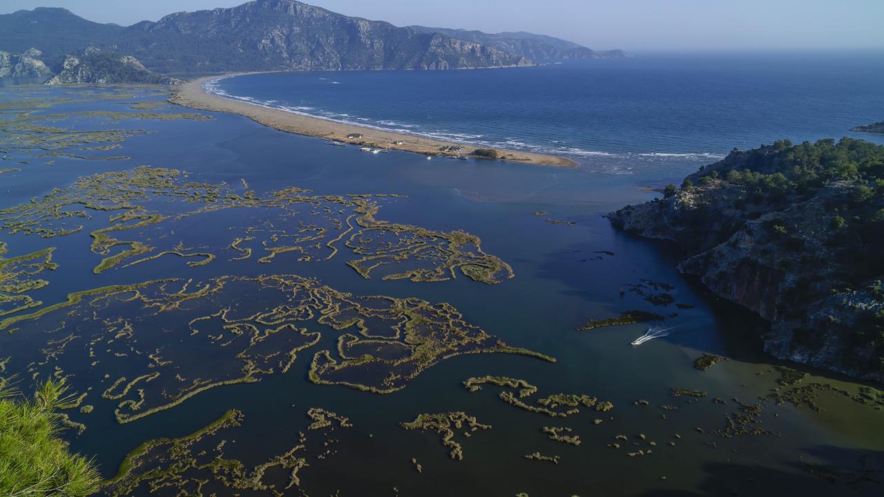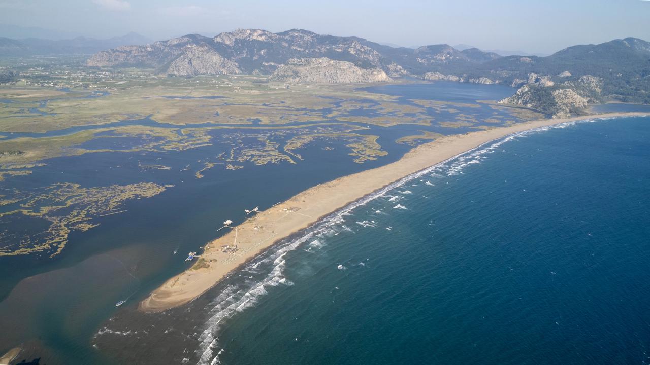 Muğla'nın önemli turizm destinasyonlarından Ortaca ilçesindeki Dalyan Mahallesi'nde bulunan, caretta caretta deniz kaplumbağaları için önemli bir üreme alanı olan ve dünyada en iyi korunan plajları arasında gösterilen İztuzu Plajı ile yanındaki Dalyan Kanalı havadan görüntülendi.