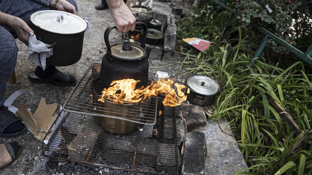 İzyum`daki apartmanların birçoğunun önünde, açık havada yaktıkları ateşle yemek pişirmeye çalışanlara rastlanıyor.