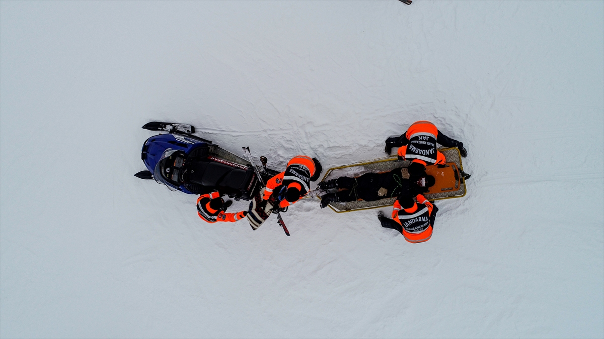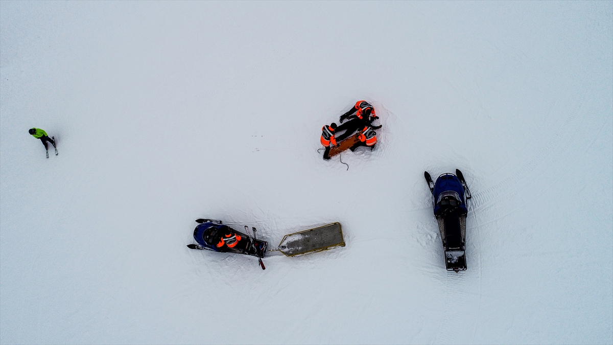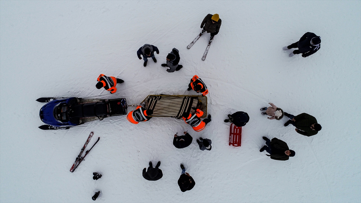 Arama ve kurtarma konusunda her türlü ekipmana sahip olan, olumsuzluklara anında müdahale eden tim, yaralananları ilk müdahaleyi yaparak kayak merkezine taşıyor.