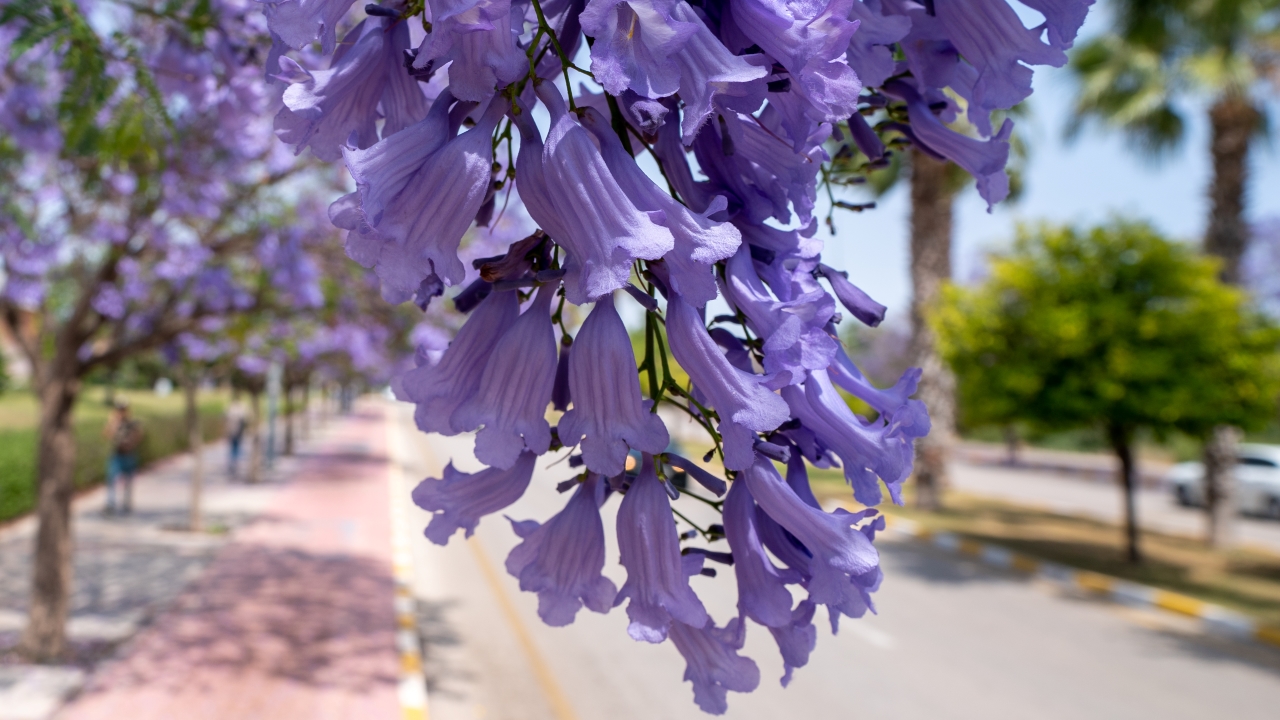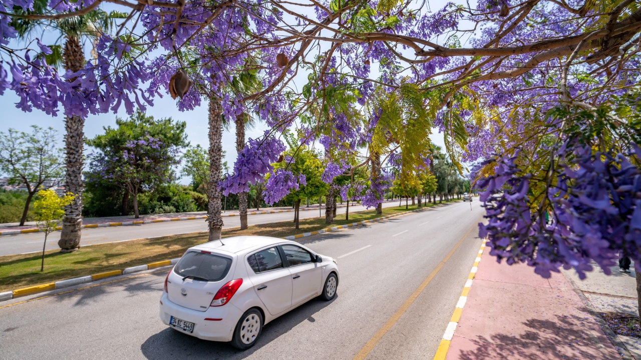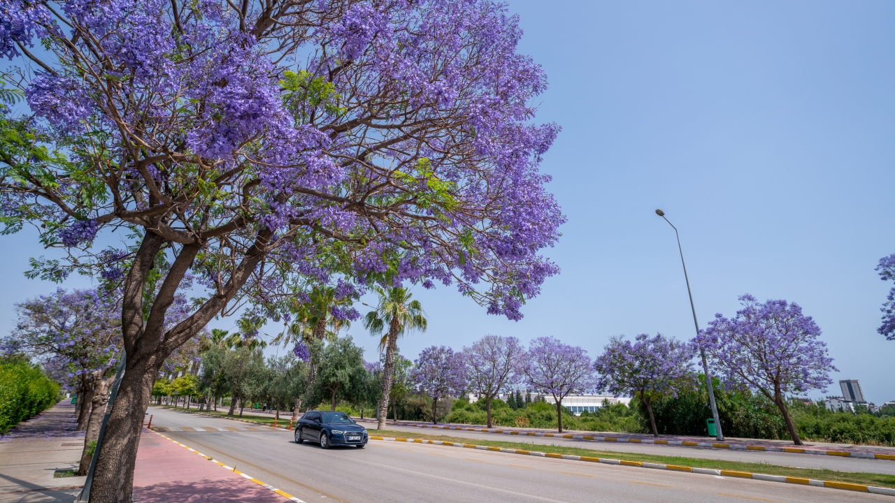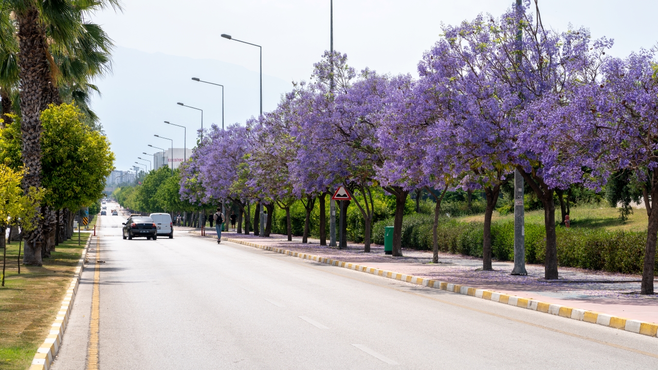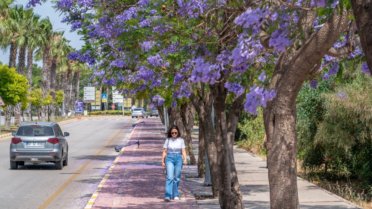 Bugünlerde Antalya`da sürücüler, jakaranda ağaçlarının renkleri eşliğinde ilerlerken; yayalar, salkımlar halinde sarkan ve kaldırımlara dökülen çiçeklerin arasında yürümenin keyfini çıkarıyor.