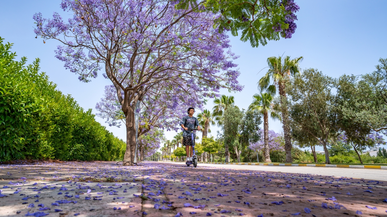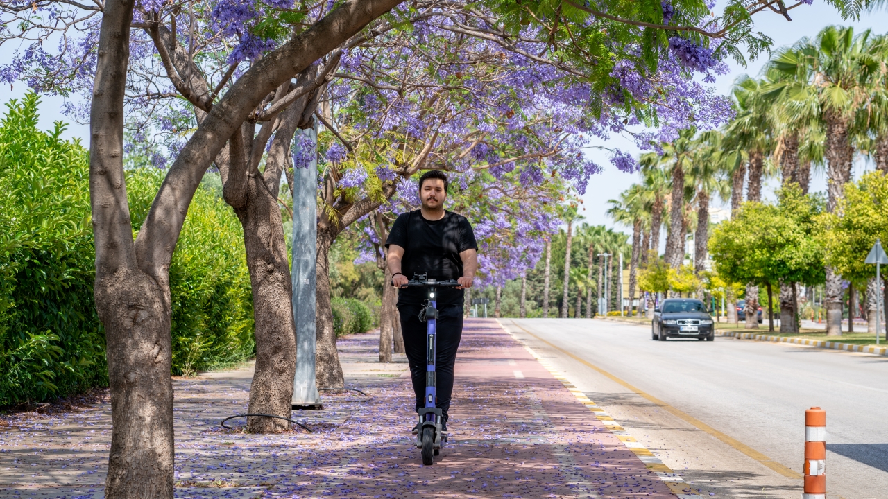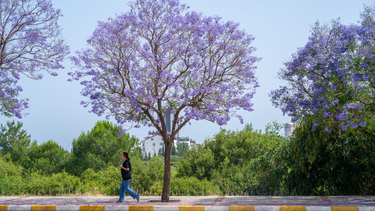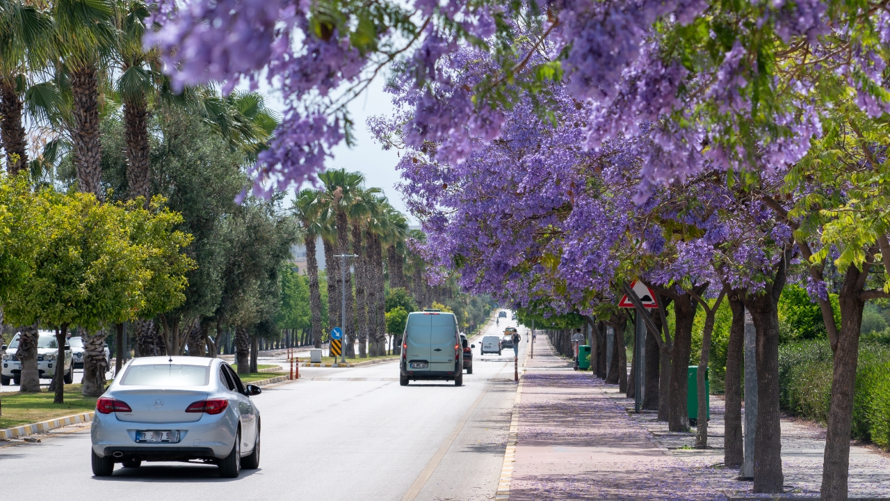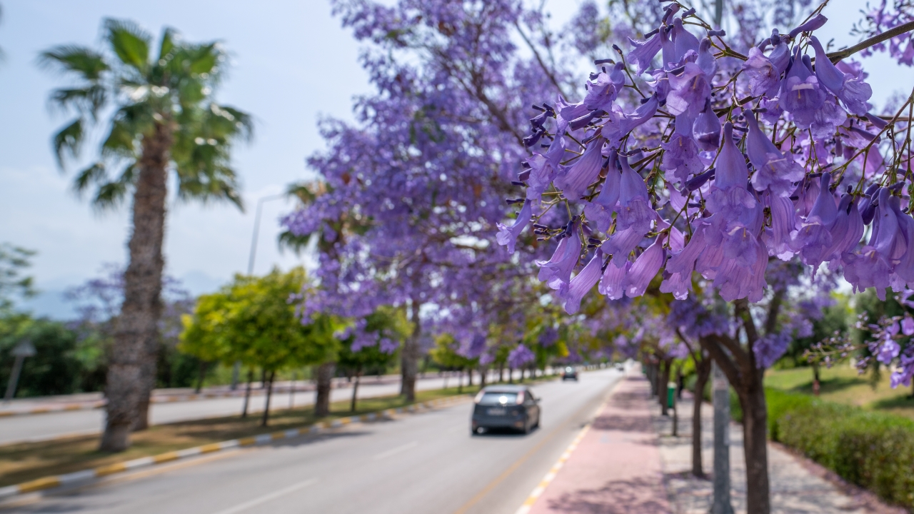 Bugünlerde Antalya`da sürücüler, jakaranda ağaçlarının renkleri eşliğinde ilerlerken; yayalar, salkımlar halinde sarkan ve kaldırımlara dökülen çiçeklerin arasında yürümenin keyfini çıkarıyor.