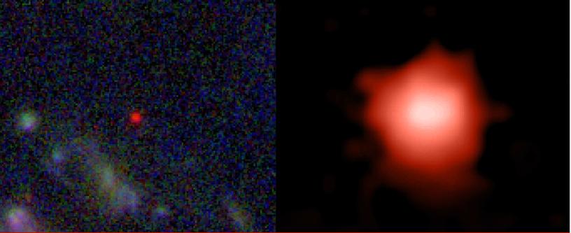 Kızılötesinden görünür spektruma çevrildiğinde, galaksi, uzak kozmosun "derin alan" olarak adlandırılan daha geniş bir görüntüsünün parçası olarak, merkezinde beyaz olan bir kırmızı leke olarak görünüyor.