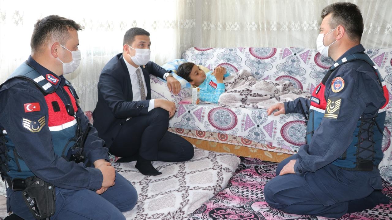 İlçe Jandarma Komutanlığı ekibi ile Kaymakam Mustafa Caner Culukar, Kerim Can`ı evinde ziyaret etti.