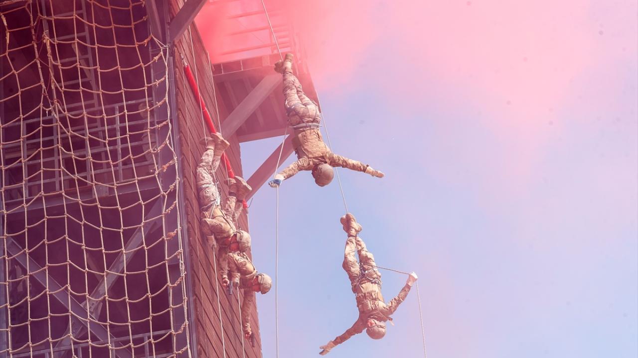 Ardından Türk bayrağı açan komandolar, katılımcılardan alkış aldı.