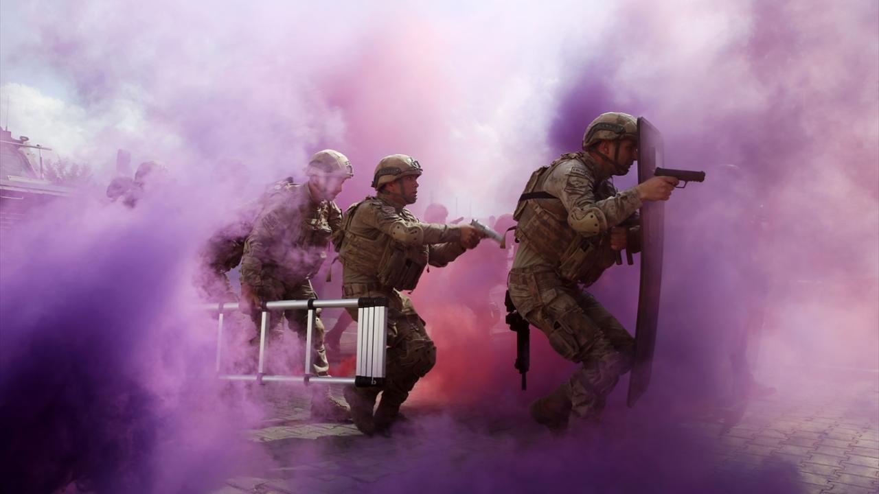 Muş`ta, Jandarma Teşkilatının 183. kuruluş yıl dönümü dolayısıyla çeşitli programlar düzenlendi. İl Jandarma Komutanlığı timlerince düzenlenen tatbikatta senaryo gereği teröristlerce otobüste rehin alınan güvenlik güçlerinin kurtarılmasına yönelik operasyon göz doldurdu. (Arşiv-14.06.2022)