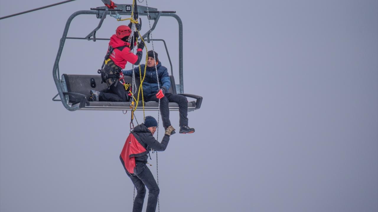 Türkiye`nin önemli kayak merkezlerinden Kars`taki Cıbıltepe`de görev yapan Jandarma Arama Kurtarma (JAK) timleri, turistlerin güven içinde tatil yapması için hazırlıklarını tamamladı. Halat yardımıyla telesiyeje çıkan timler, 20 metre yükseklikte mahsur kalan iki turisti güvenle piste indirdi. (Arşiv-23.12.2022)