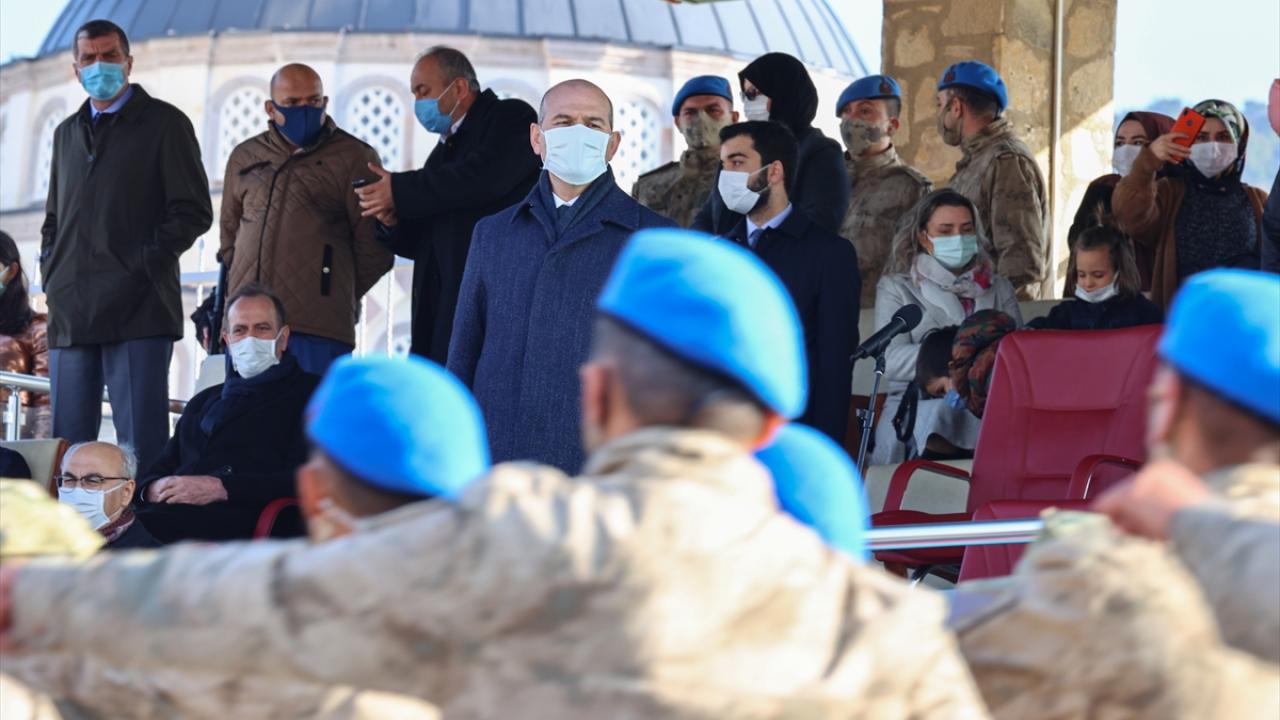 Bakan Soylu askerlerin kendisine verdiği Türk Bayrağı`nı öperek teslim aldı.