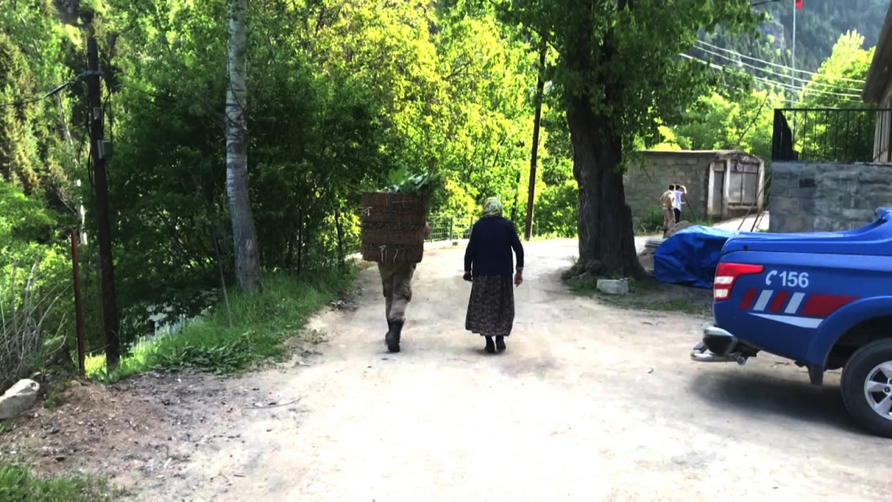 Artvin'in Yusufeli ilçesinde jandarma, ot dolu sepeti sırtında taşıyan yaşlı kadına yardım etti. Altıparmak köyünde rutin devriye faaliyetlerini yürüten jandarma ekipleri, bahçesinden biçtiği otları yüklediği sepetini sırtında taşıyarak evine doğru yürüyen 76 yaşındaki Fatma Zehra Karahan ile karşılaştı. Ekipte görevli jandarma, Karahan'dan aldığı sepeti sırtına takarak kadının aynı bölgedeki evine kadar taşıdı.
