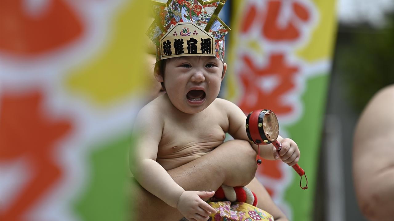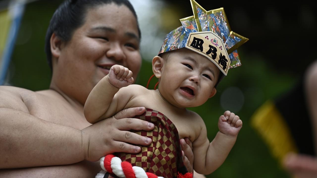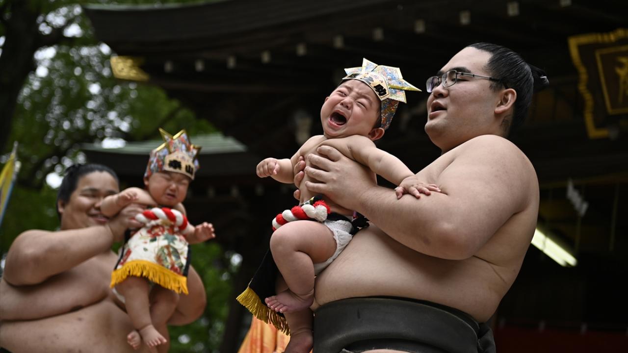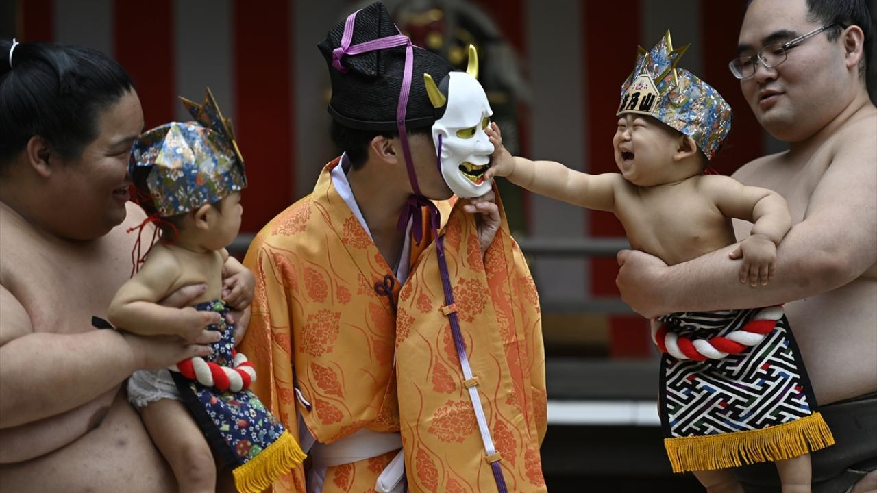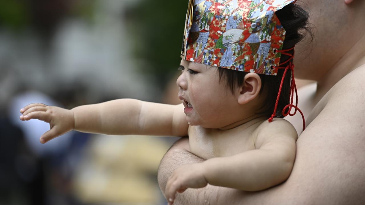 Japonya'nın başkenti Tokyo'da bulunan Sensoji tapınağında düzenlenen "Nakizumo" veya ağlayan sumo bebek yarışması olarak bilinen geleneksel festival'de sumo ringine çıkan bebekler "Gyoji" adı verilen hakemler tarafından maskeyle korkutulup ağlatılıyor.
