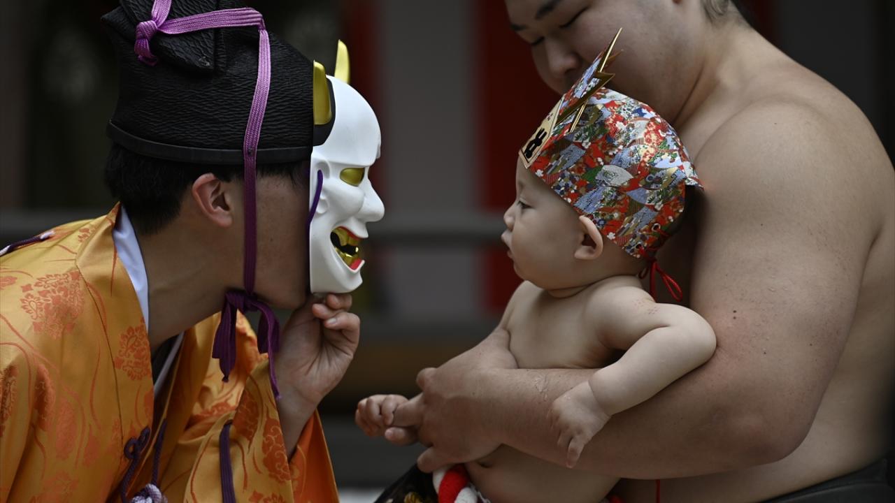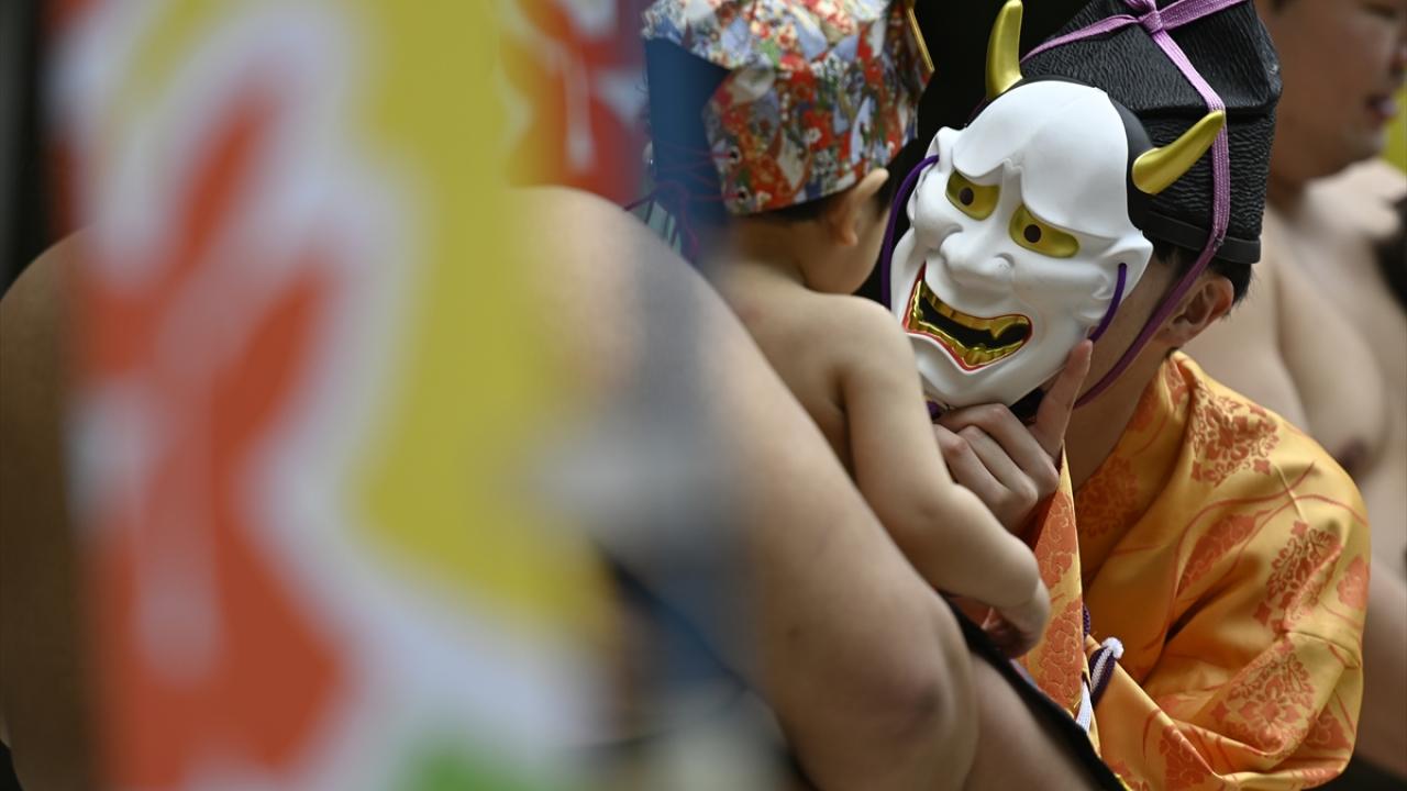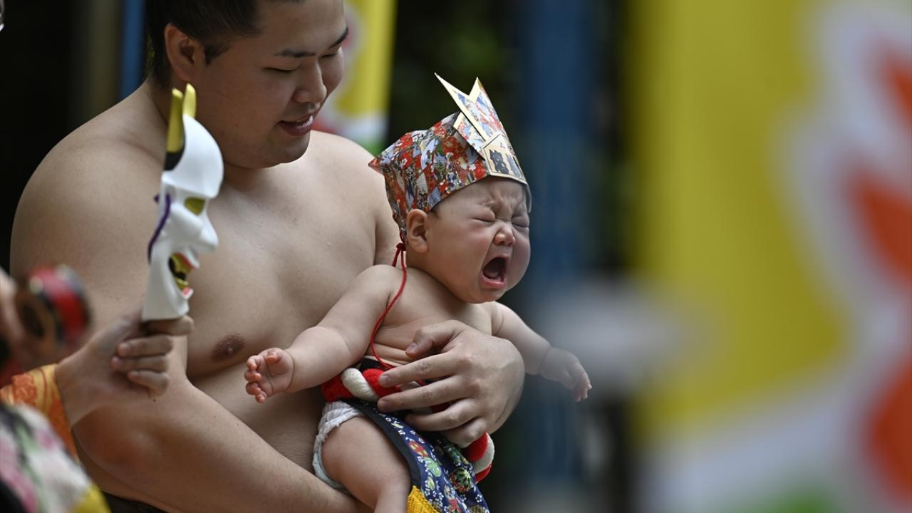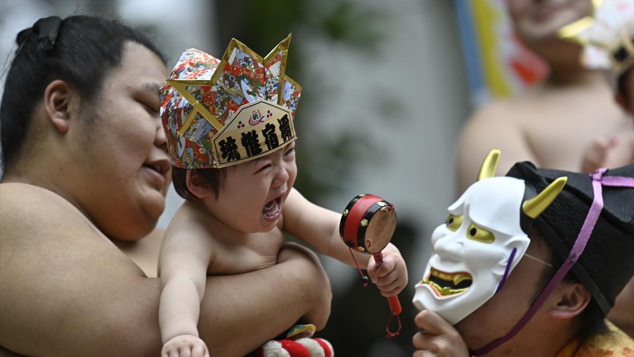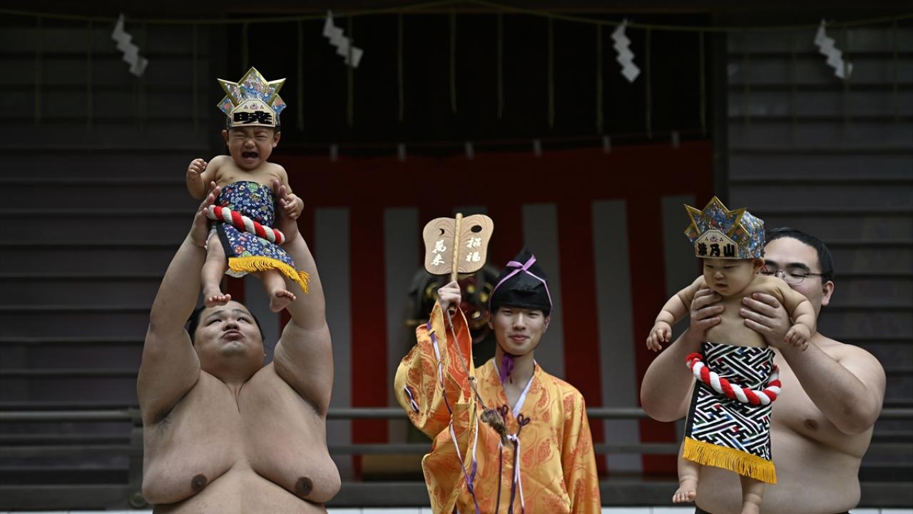 Japonya'nın başkenti Tokyo'da bulunan Sensoji tapınağında düzenlenen "Nakizumo" veya ağlayan sumo bebek yarışması olarak bilinen geleneksel festival'de sumo ringine çıkan bebekler "Gyoji" adı verilen hakemler tarafından maskeyle korkutulup ağlatılıyor.
