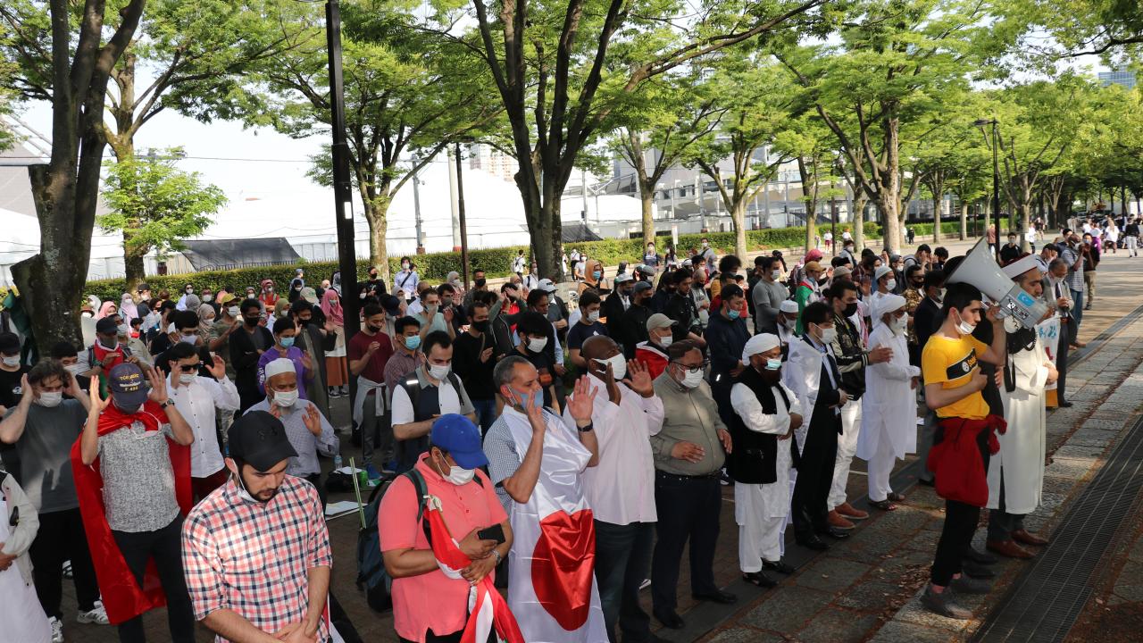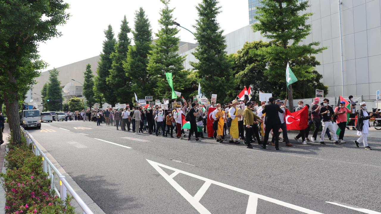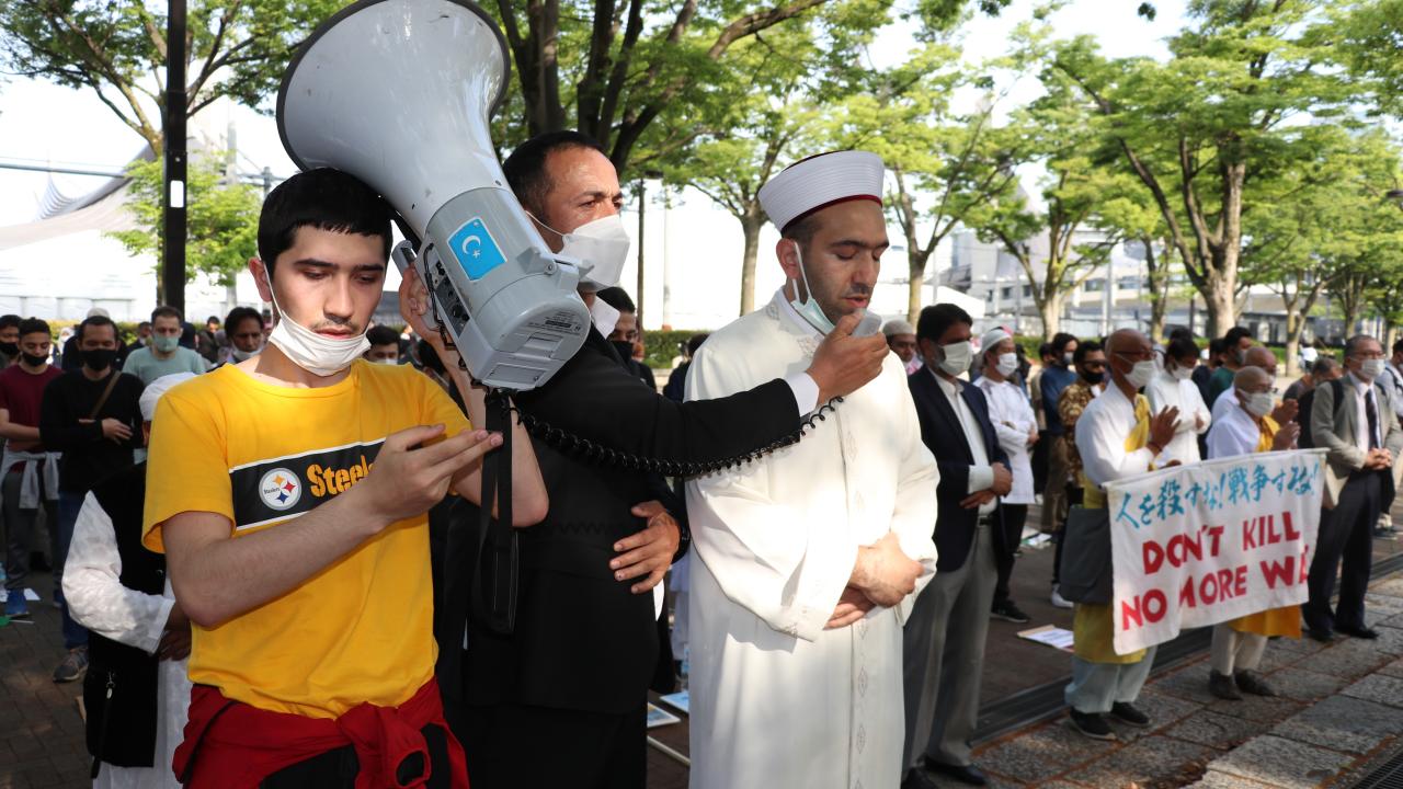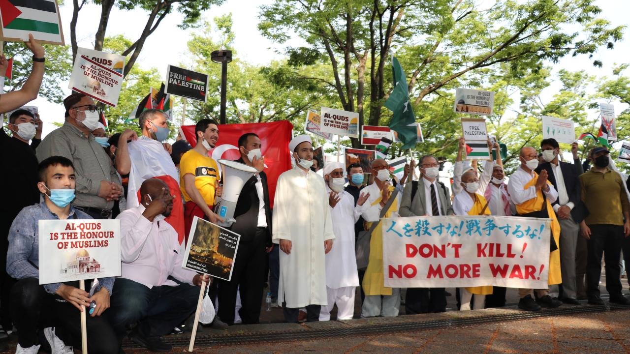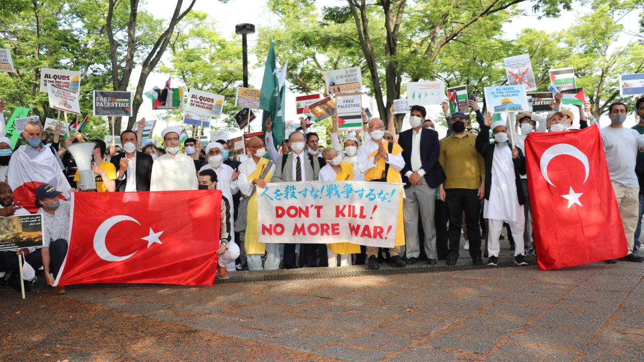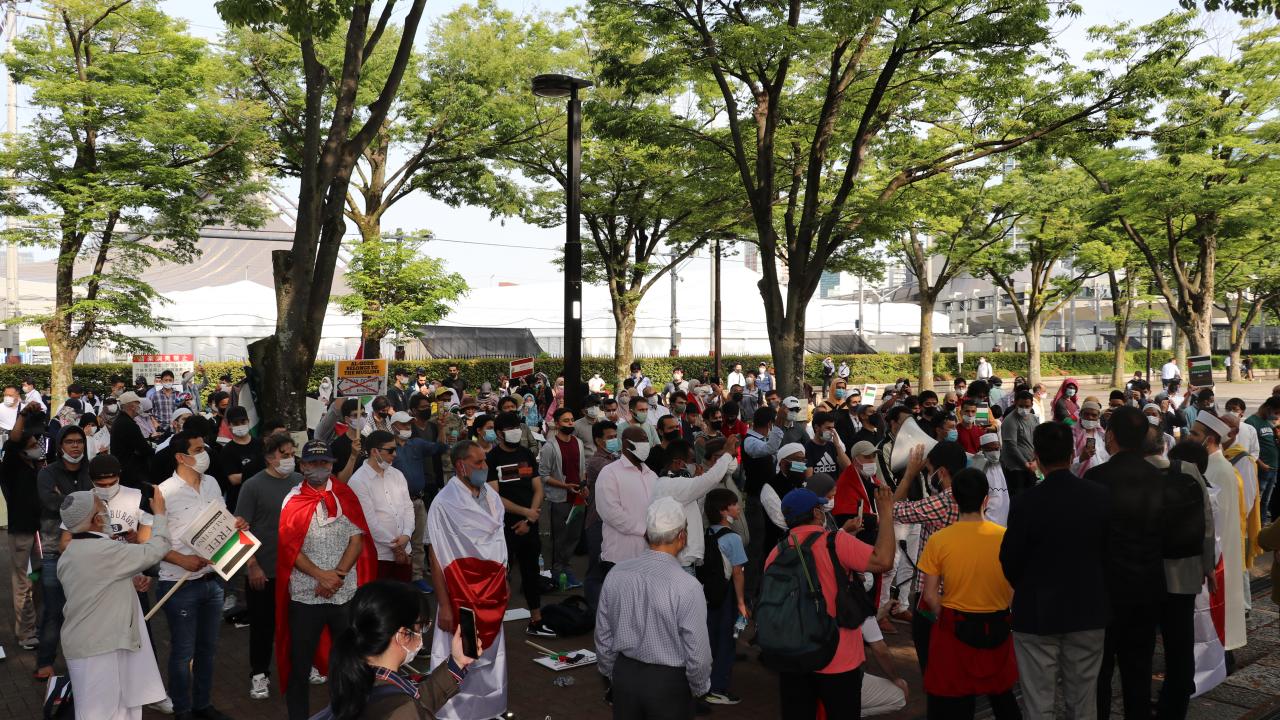 Tokyo Camisi İmam Hatibi Muhammet Rıfat Çınar, Yoyogi Park`a ulaşan gruplara Filistin`de verilen şehitler dolayısıyla gıyabi cenaze namazı kıldırdı.