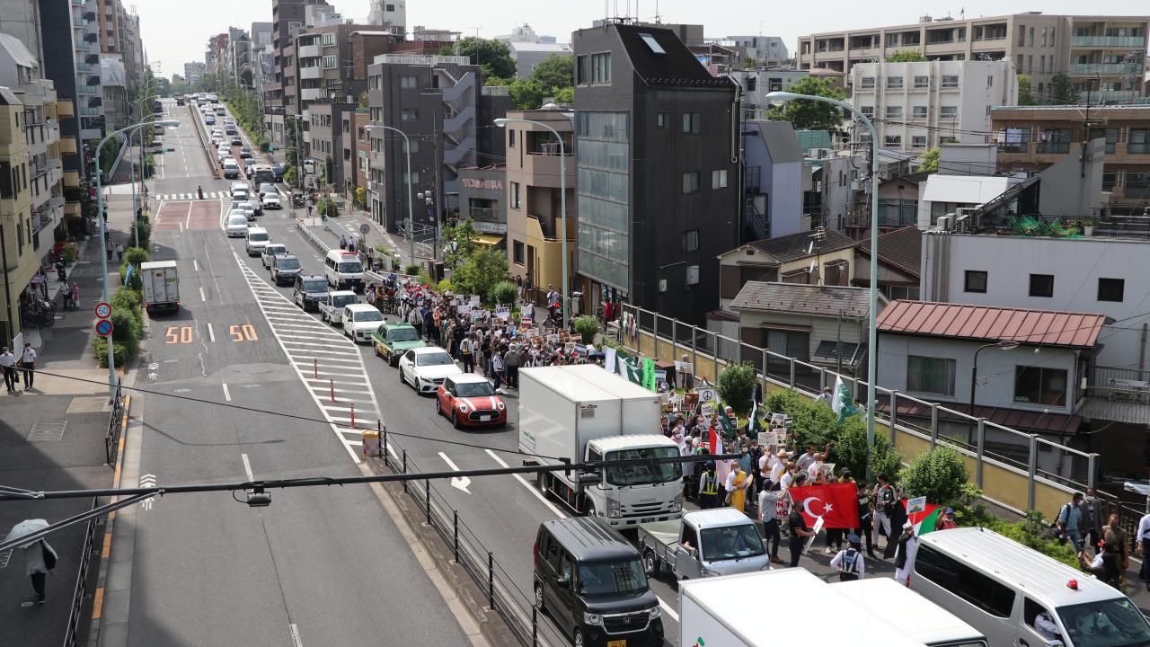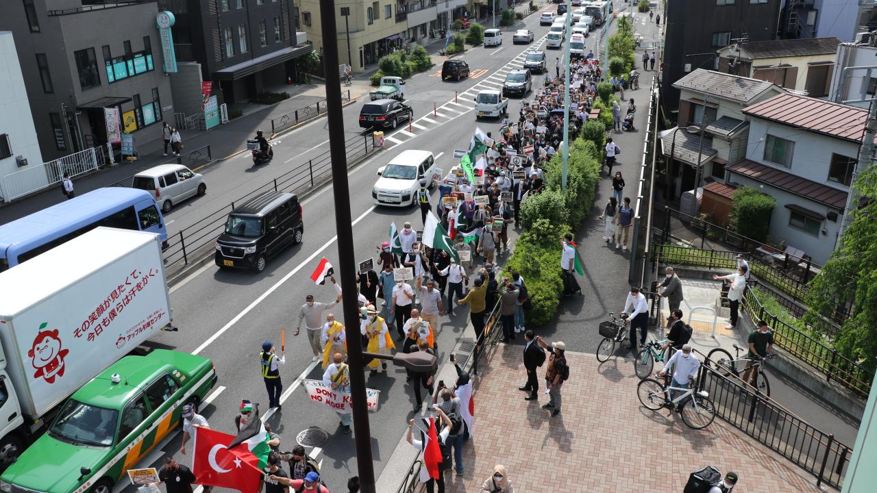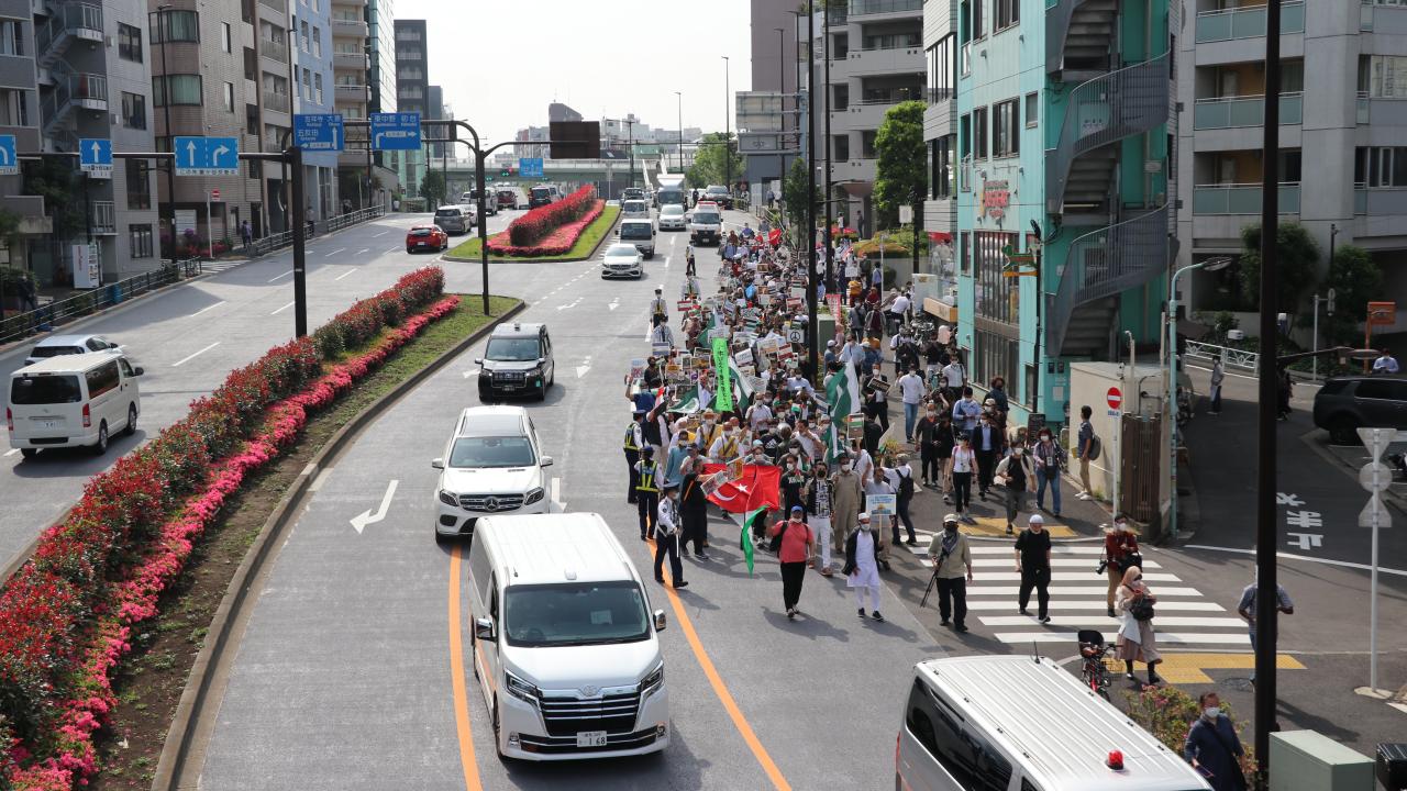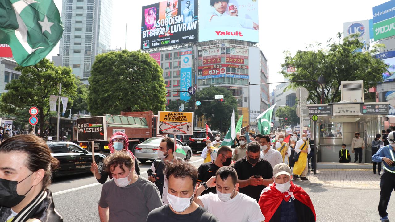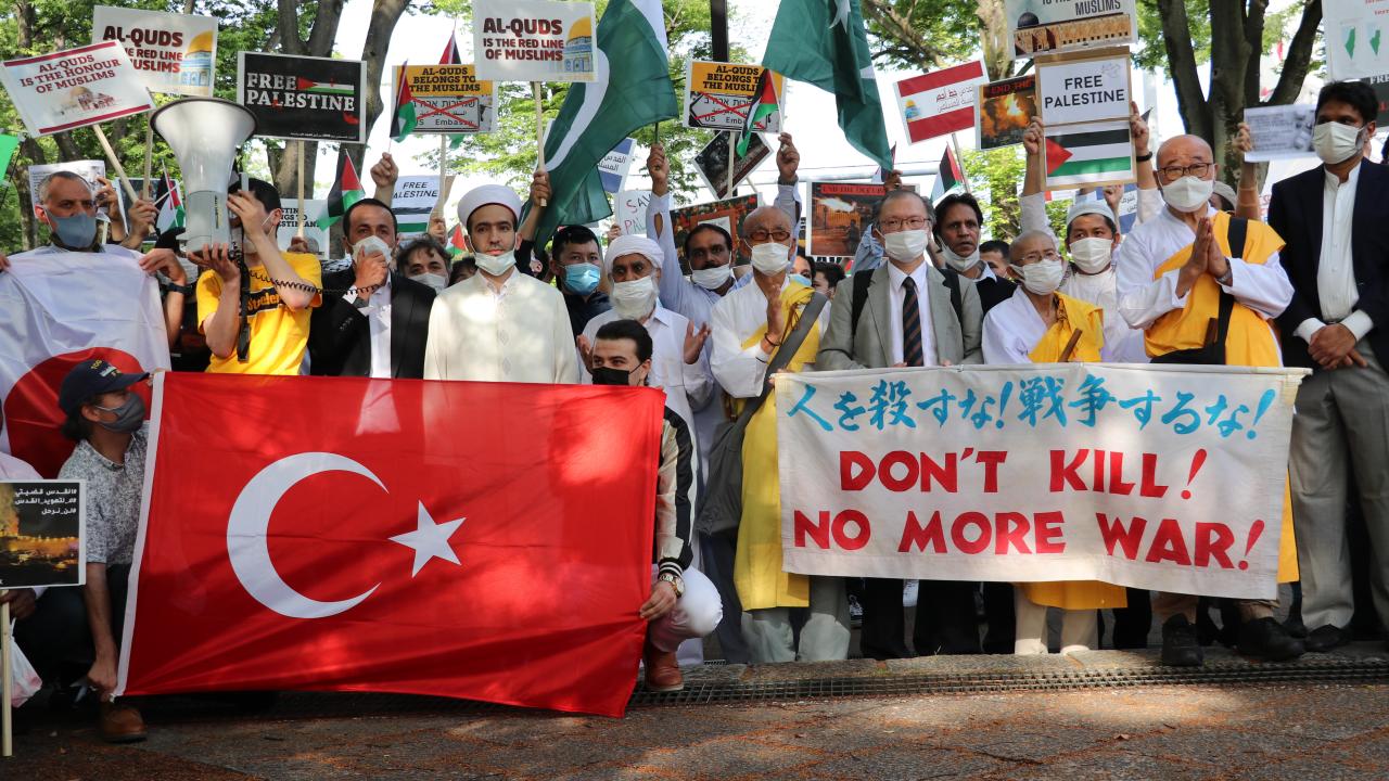 Tokyo Camisi İmam Hatibi Muhammet Rıfat Çınar, Yoyogi Park`a ulaşan gruplara Filistin`de verilen şehitler dolayısıyla gıyabi cenaze namazı kıldırdı.
