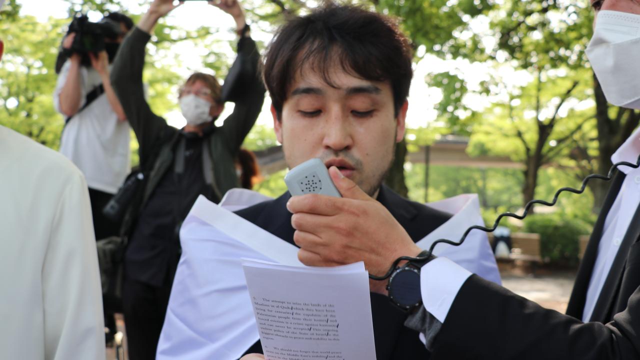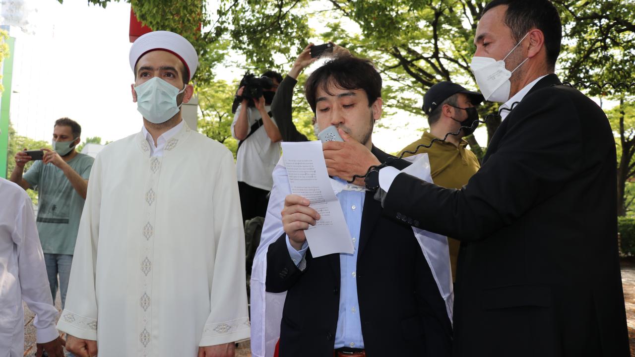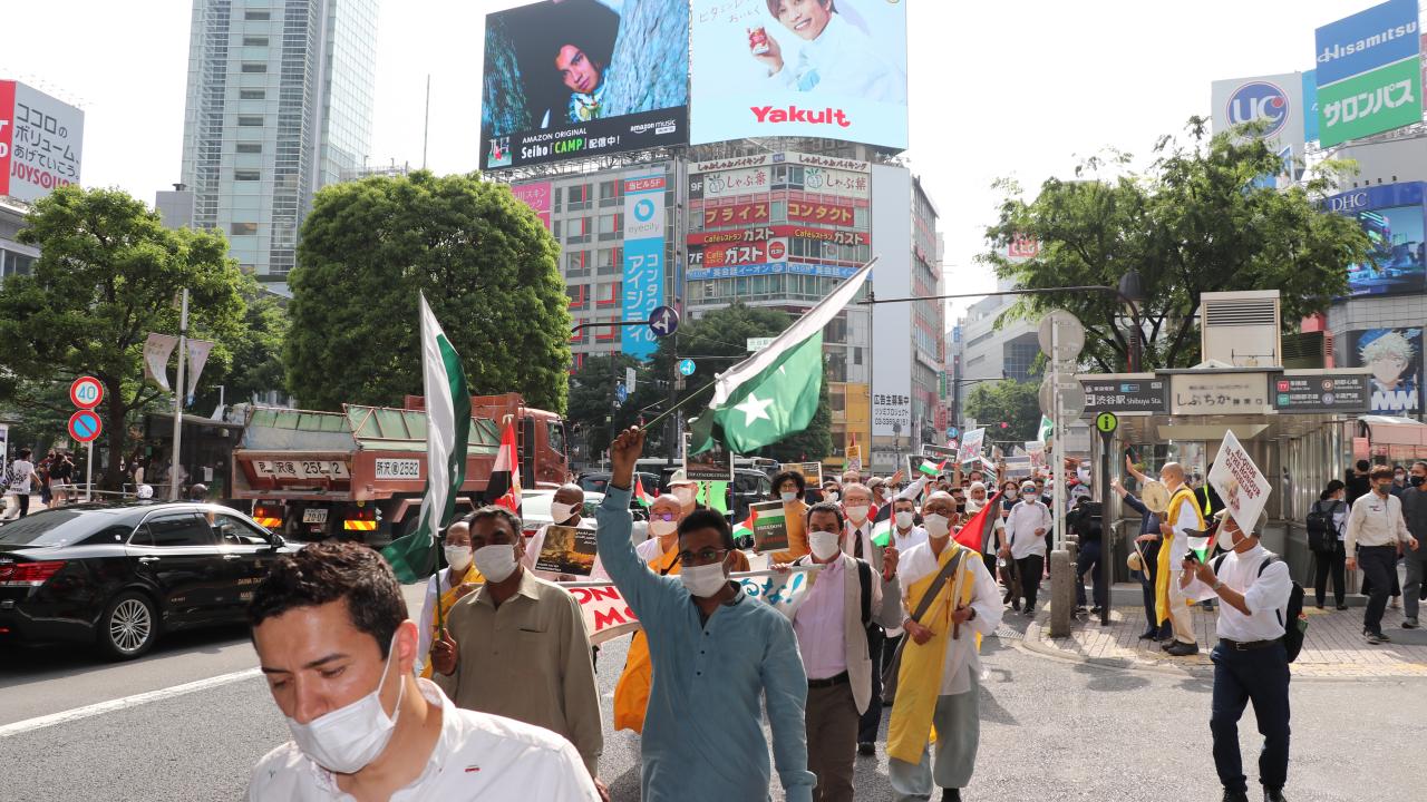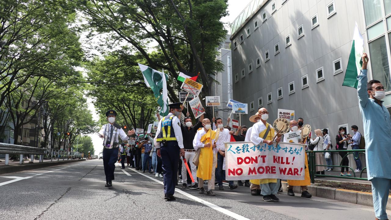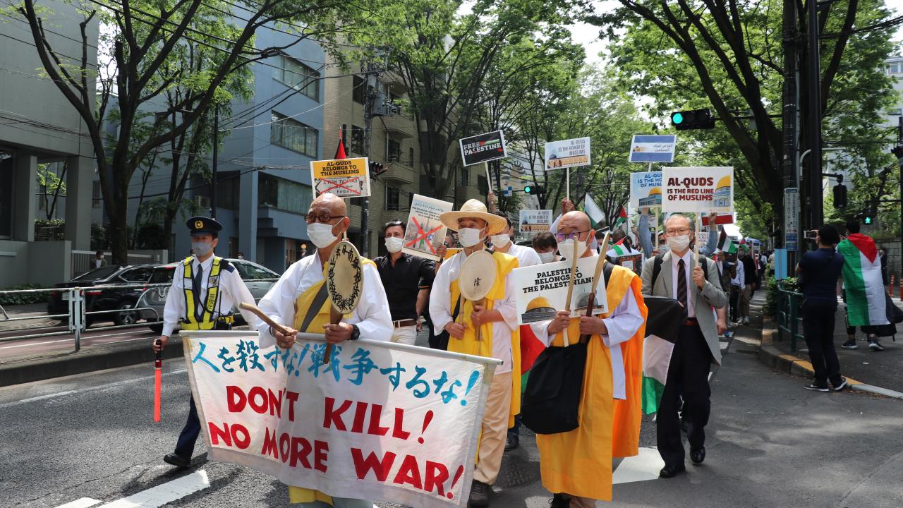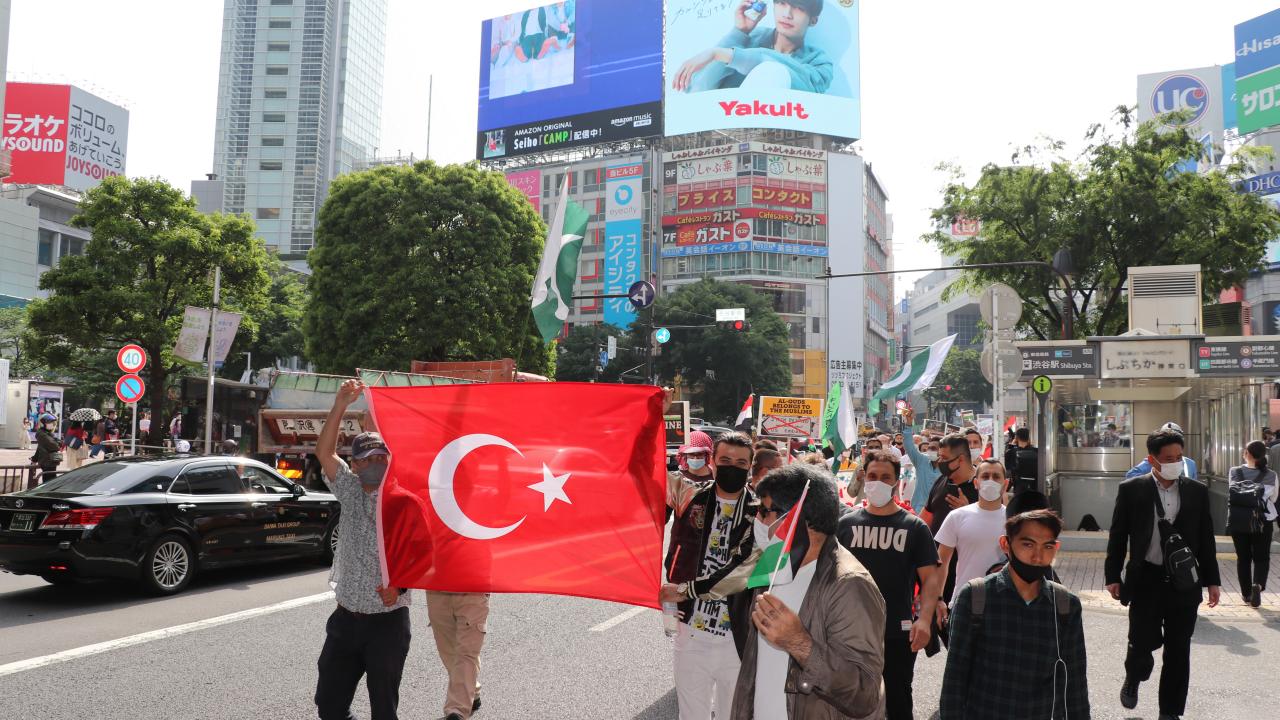 Tokyo Camisi İmam Hatibi Muhammet Rıfat Çınar, Yoyogi Park`a ulaşan gruplara Filistin`de verilen şehitler dolayısıyla gıyabi cenaze namazı kıldırdı.