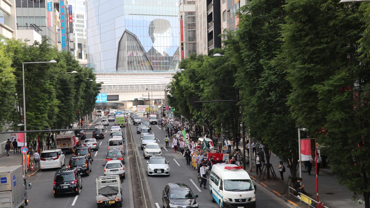 Camiden başkentin Şibuya bölgesine hareket eden gruplar polis kordonu eşliğinde Harajuku üzerinden Yoyogi Park`a yürüdü.