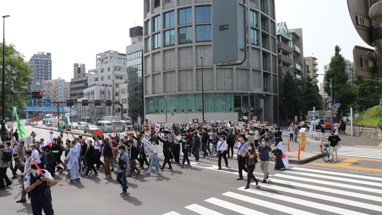 Mısır, Pakistan, Filistin, Japonya ve Türkiye bayraklarının taşındığı gösteride "Kahrolsun İsrail", "Terörist İsrail", "Kudüs`ün işgali durdurulsun", "Filistin`e özgürlük" sloganları atıldı.