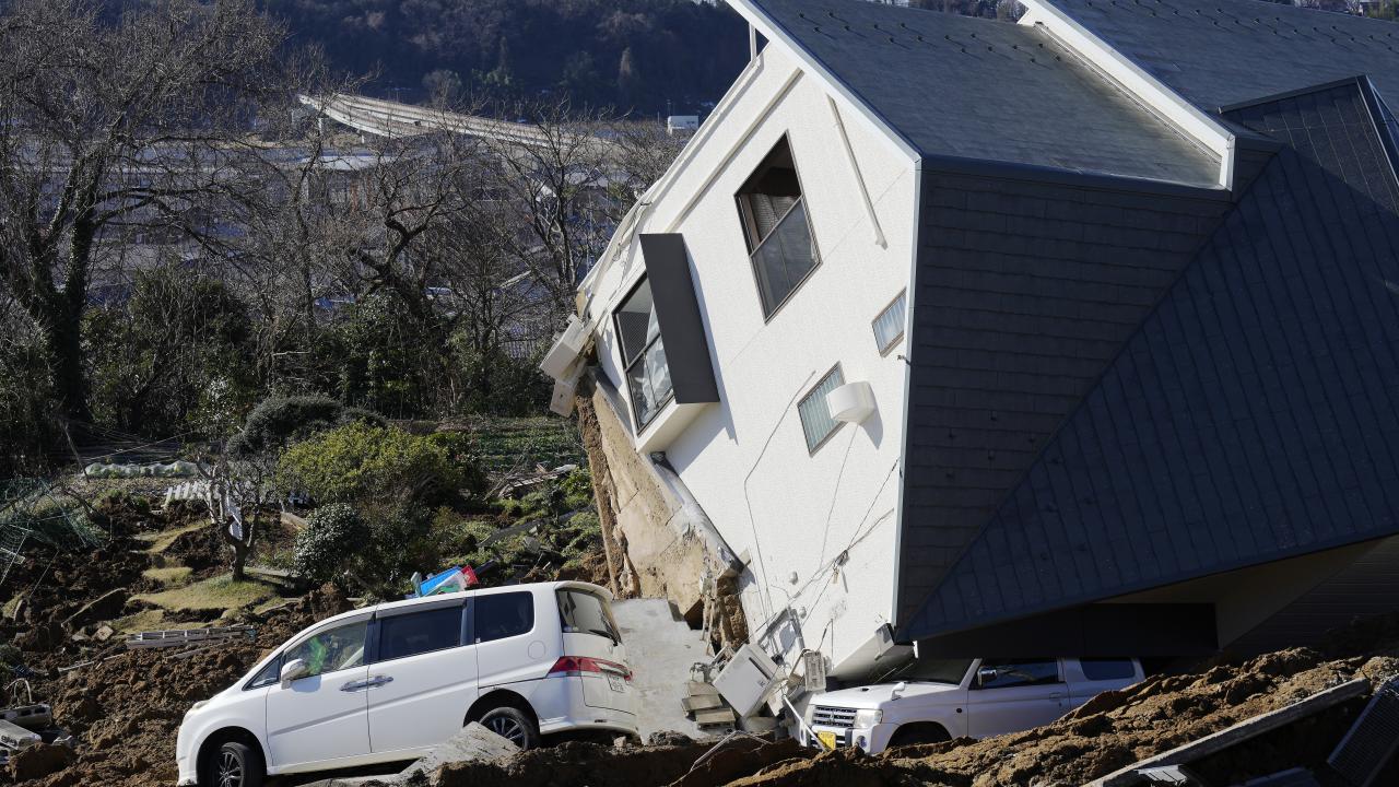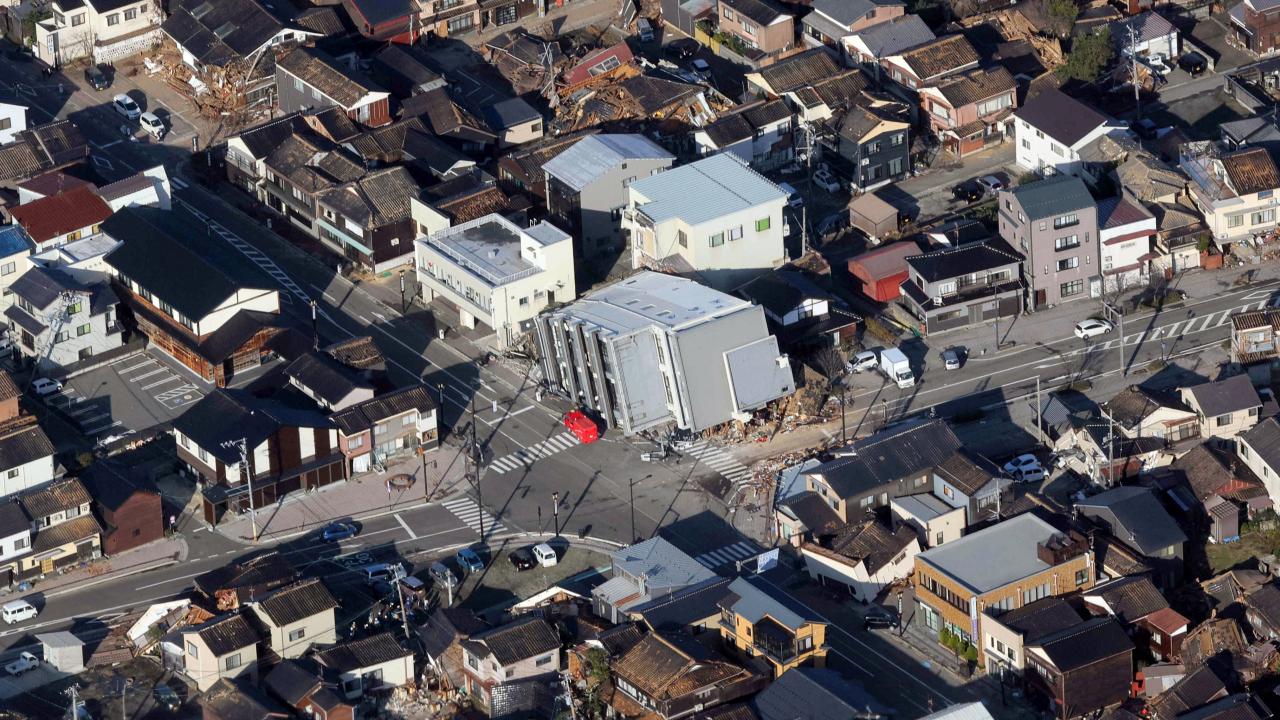 Devlet televizyonu NHK`ye ait görüntüde, Wajima`da 7 katlı bir binanın yan yattığı görüldü.