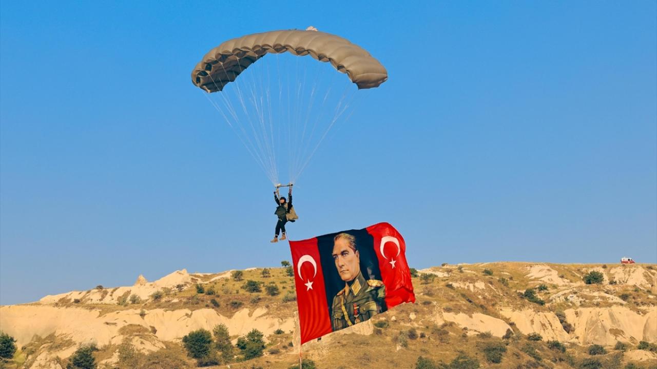 "Jandarma 186 yaşında", "Jandarma bir kanun ordusudur" pankartları, Türk bayrağı ve Gazi Mustafa Kemal Atatürk ile Cumhurbaşkanı Recep Tayyip Erdoğan`ın resimleriyle gökyüzünde süzülen paraşütçüler, Kılıçlar Vadisi yakınlarına indi.
