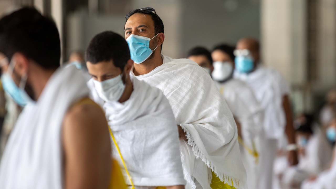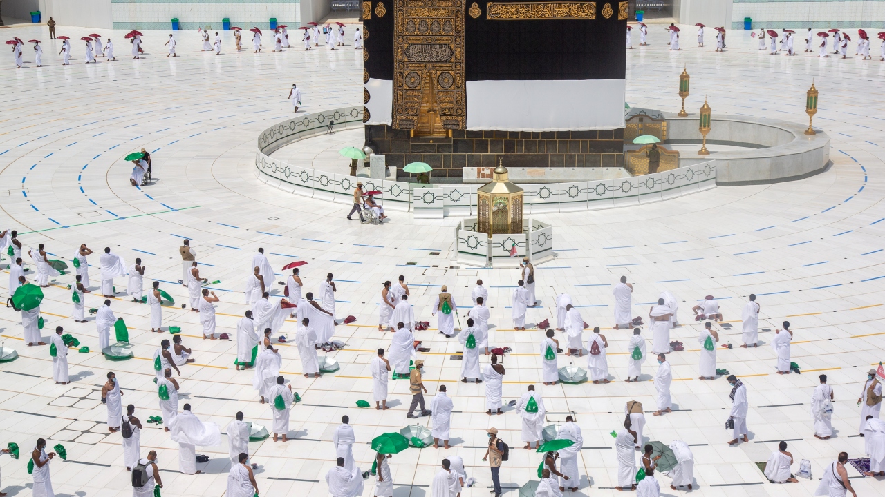 Hac vazifesi kapsamında Kabe'ye gelen Müslümanlar, sosyal mesafe kurallarına uyarak tavafa başladı.