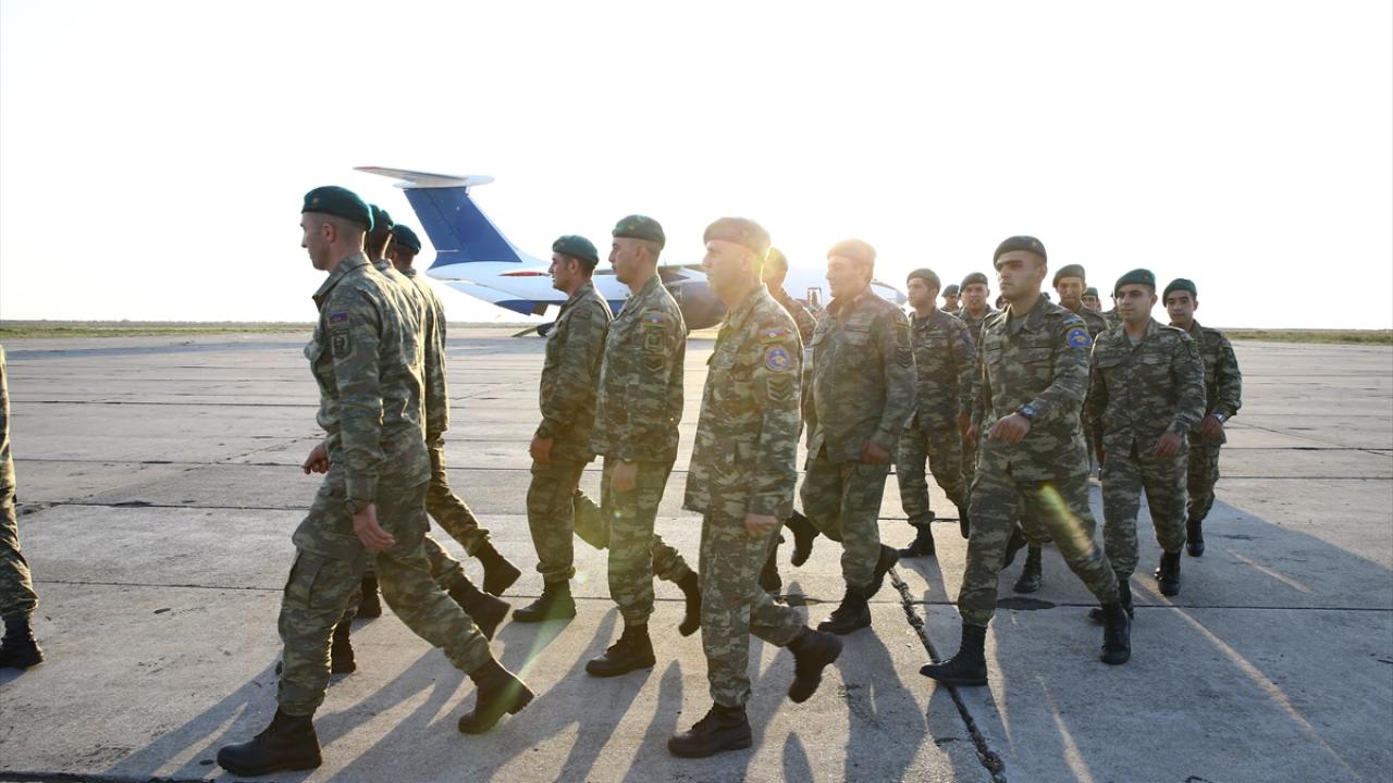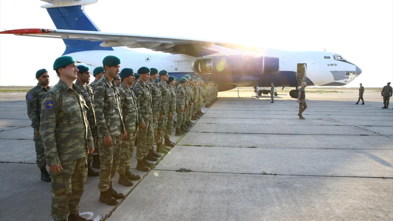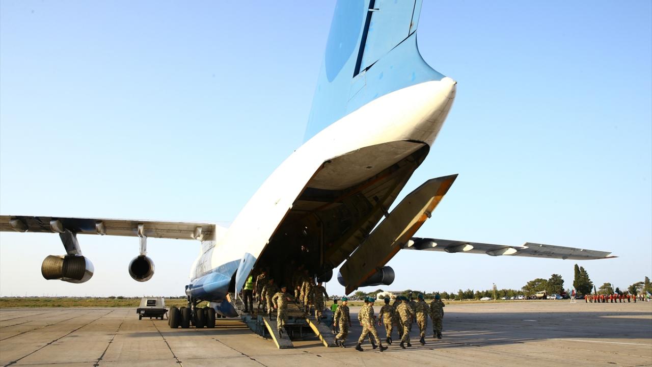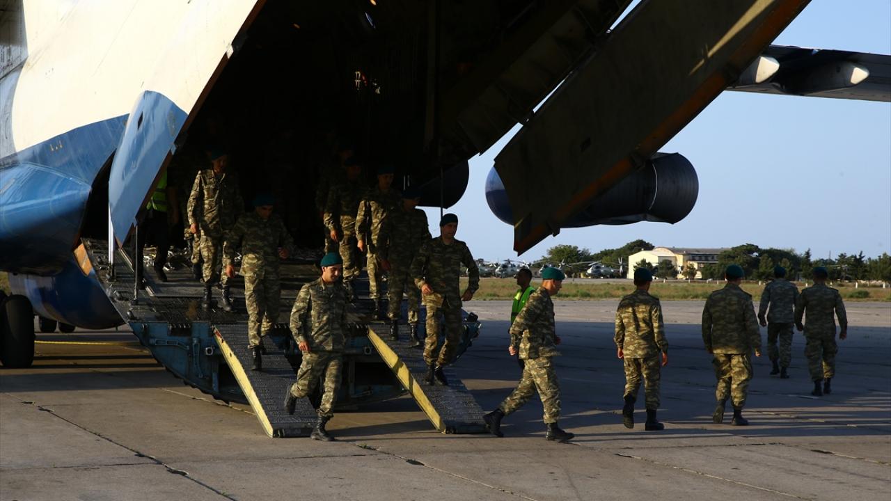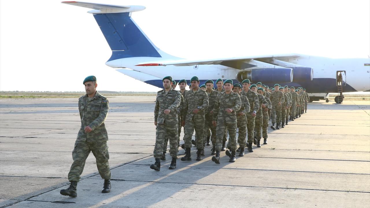 Bakü yakınlarında askeri havalimanına iniş yapan uçakla gelen askerler, törenle karşılandı.