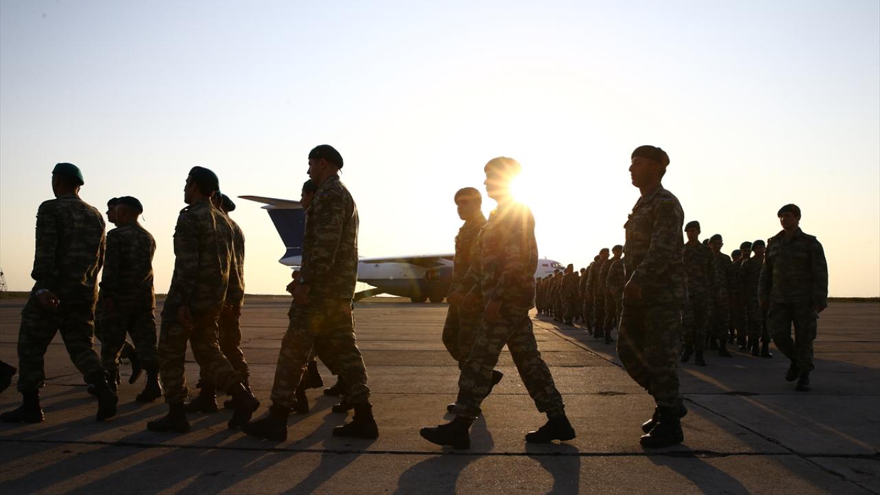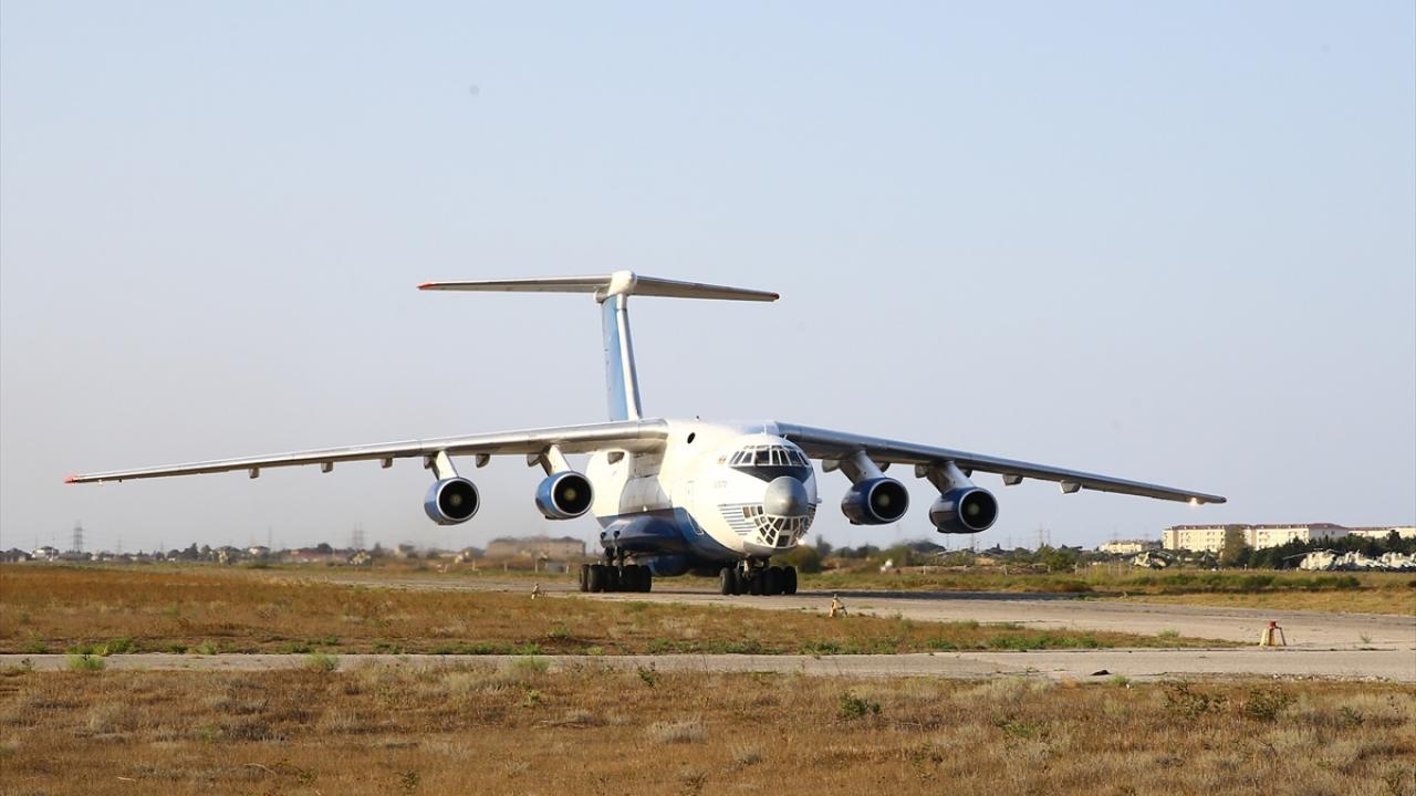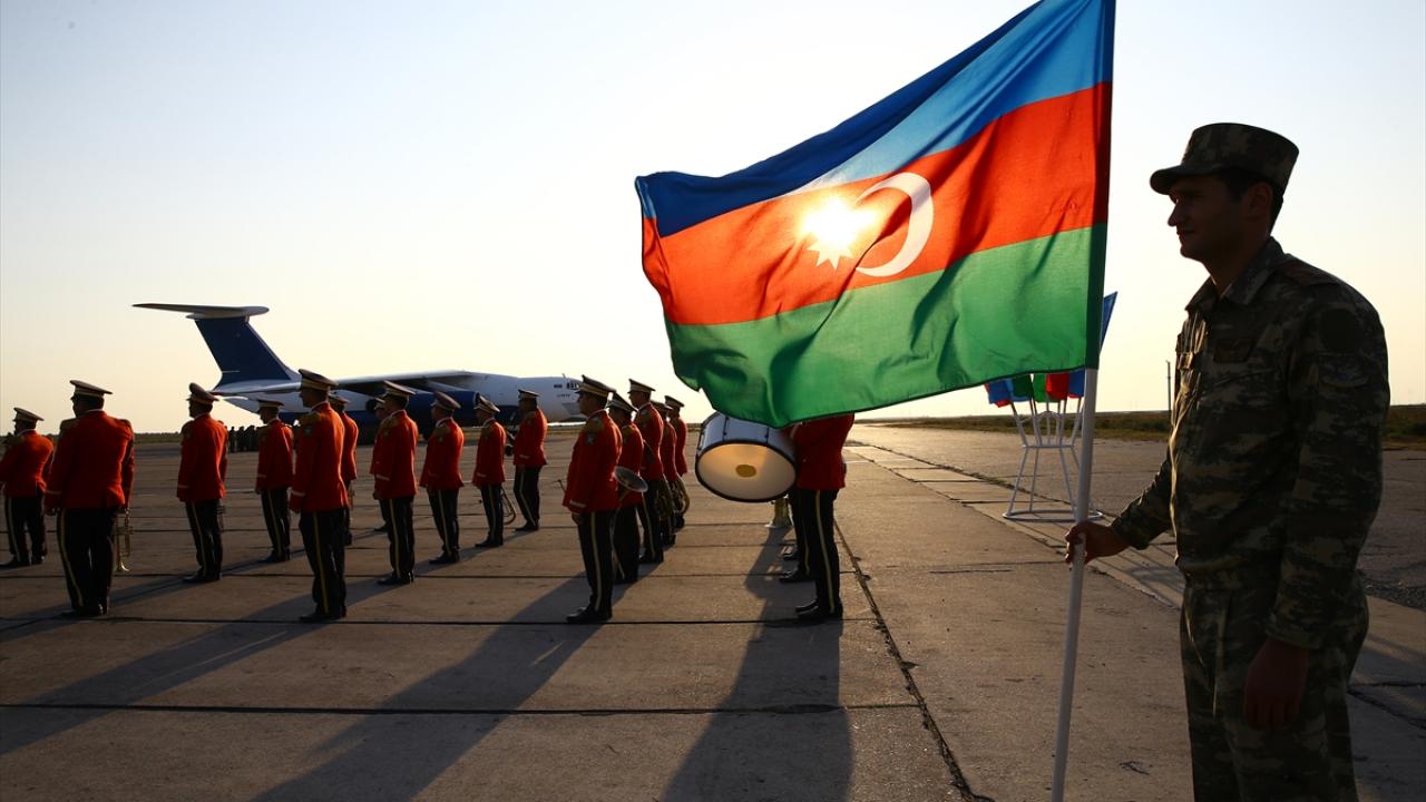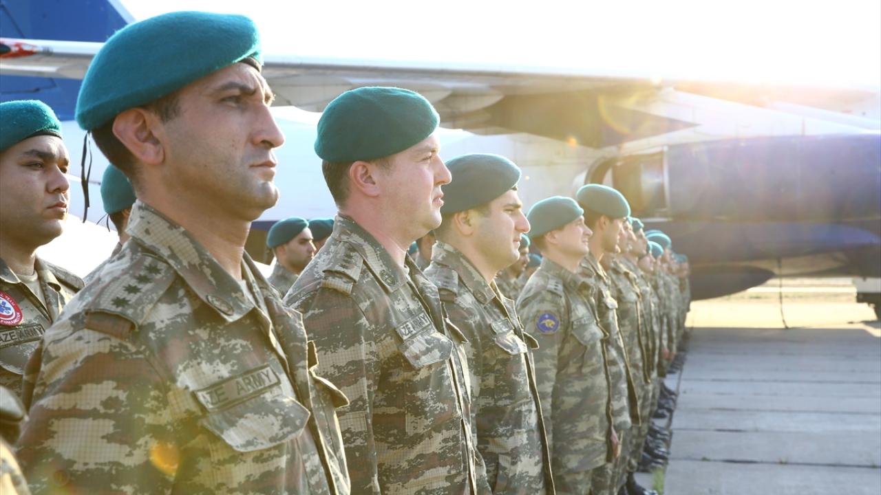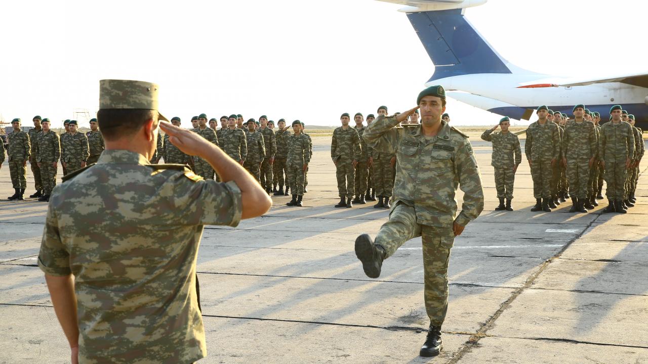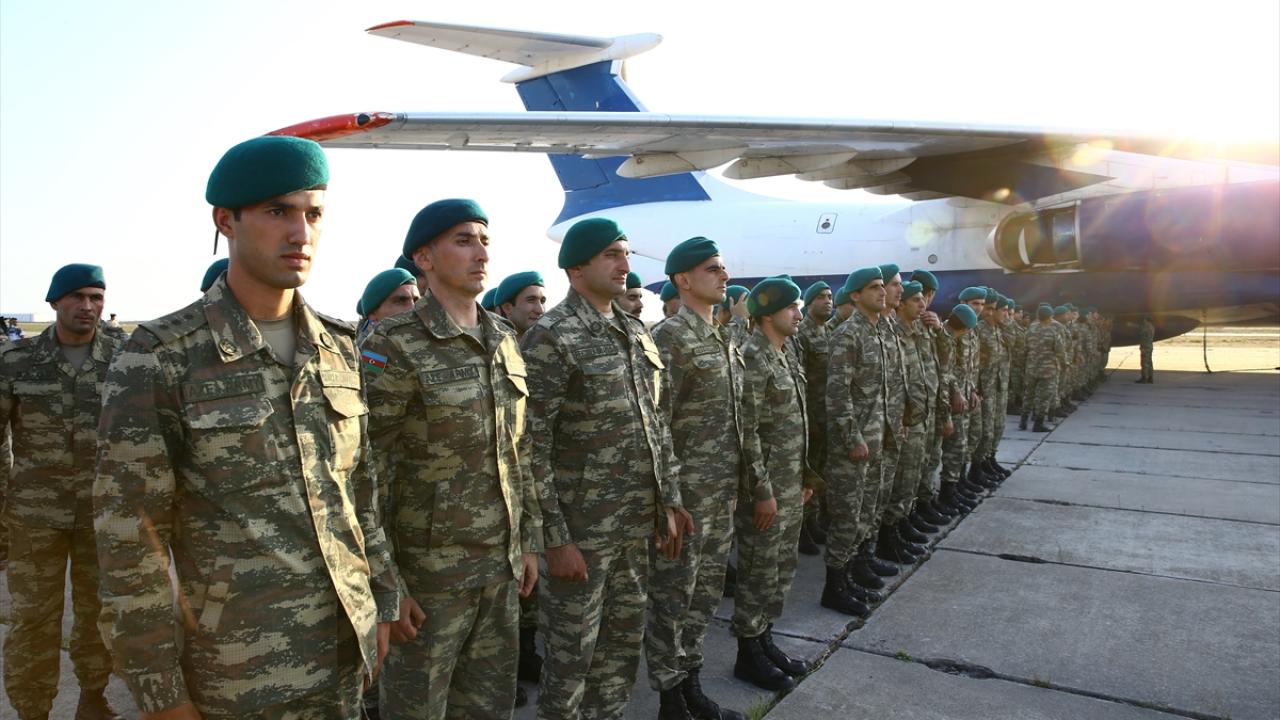 Bakü yakınlarında askeri havalimanına iniş yapan uçakla gelen askerler, törenle karşılandı.