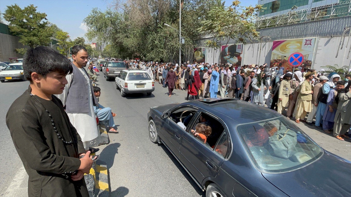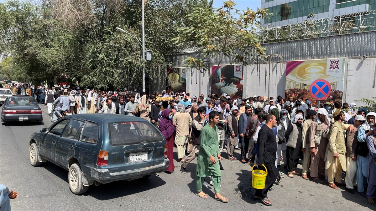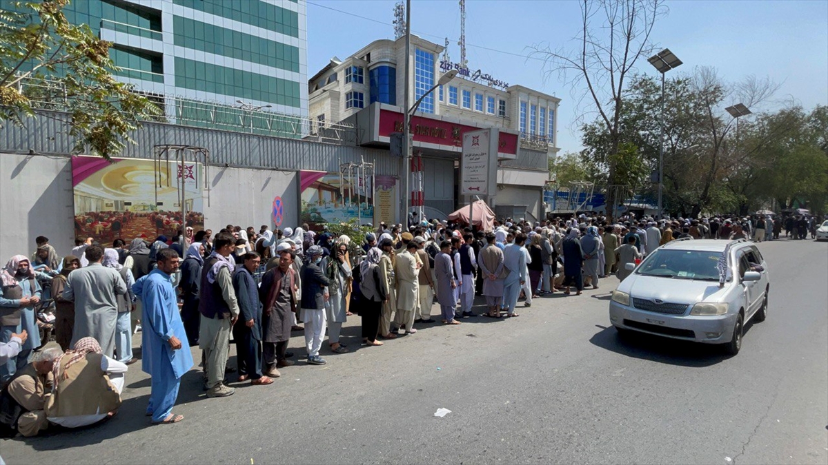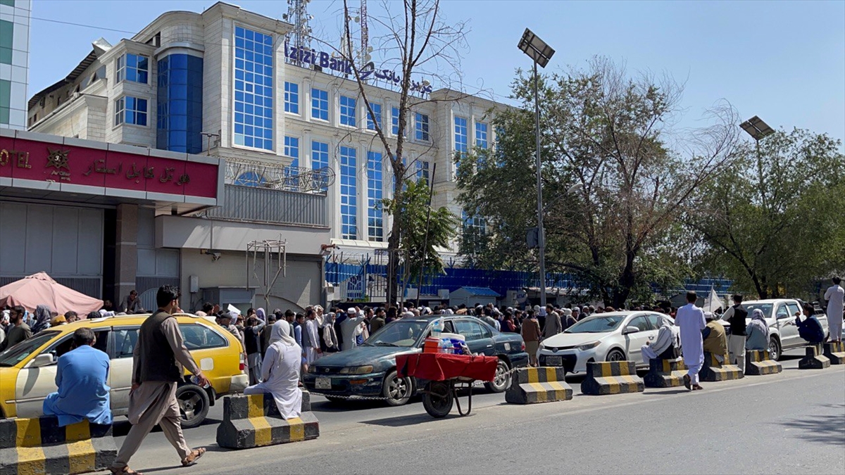 Taliban'ın kontrolü ele geçirdiği Afganistan'ın başkenti Kabil'de, kent merkezindeki bankaların önünde uzun kuyruklar oluştuğu gözlendi.