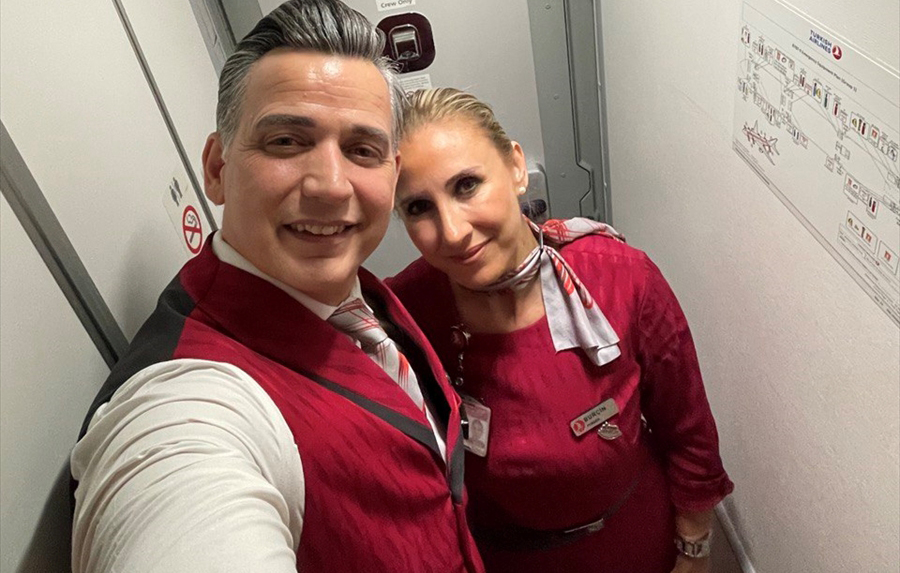 Yaklaşık 23 yıldır kabin memurluğu yapan Burçin ve Cem Işıksaçan çifti, "Dünya Kabin Memurları Günü" için havadan kutlama mesajları kaydederek, birbirlerini ve meslektaşlarını tebrik etti.