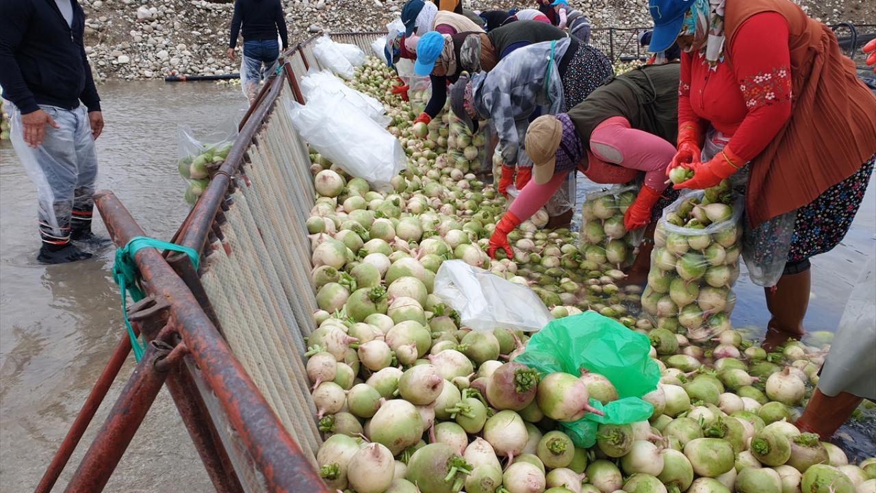 Daha sonra naylon çizmelerle soğuk suya giren kadınlar, toprağı temizlenmiş turpları yeniden yıkayıp ayıklayarak Türkiye`nin birçok iline gönderilmesi için paketliyor.