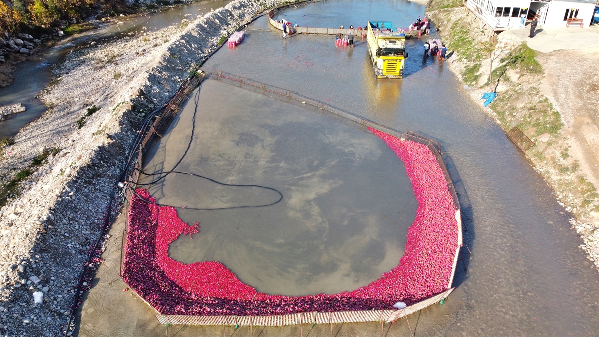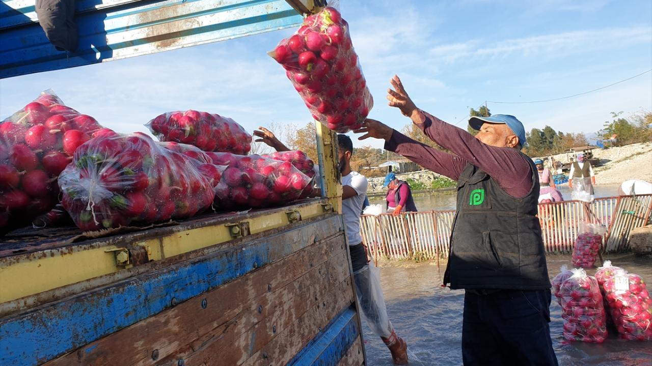 Tarladan toplanan turplar, Savrun Çayı`na getirilerek setlerle etrafı çevrilen alana dökülüyor.