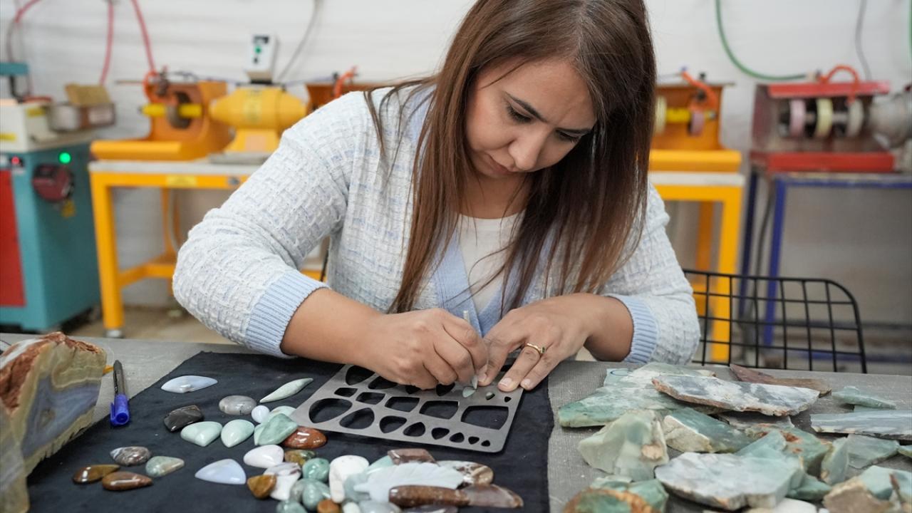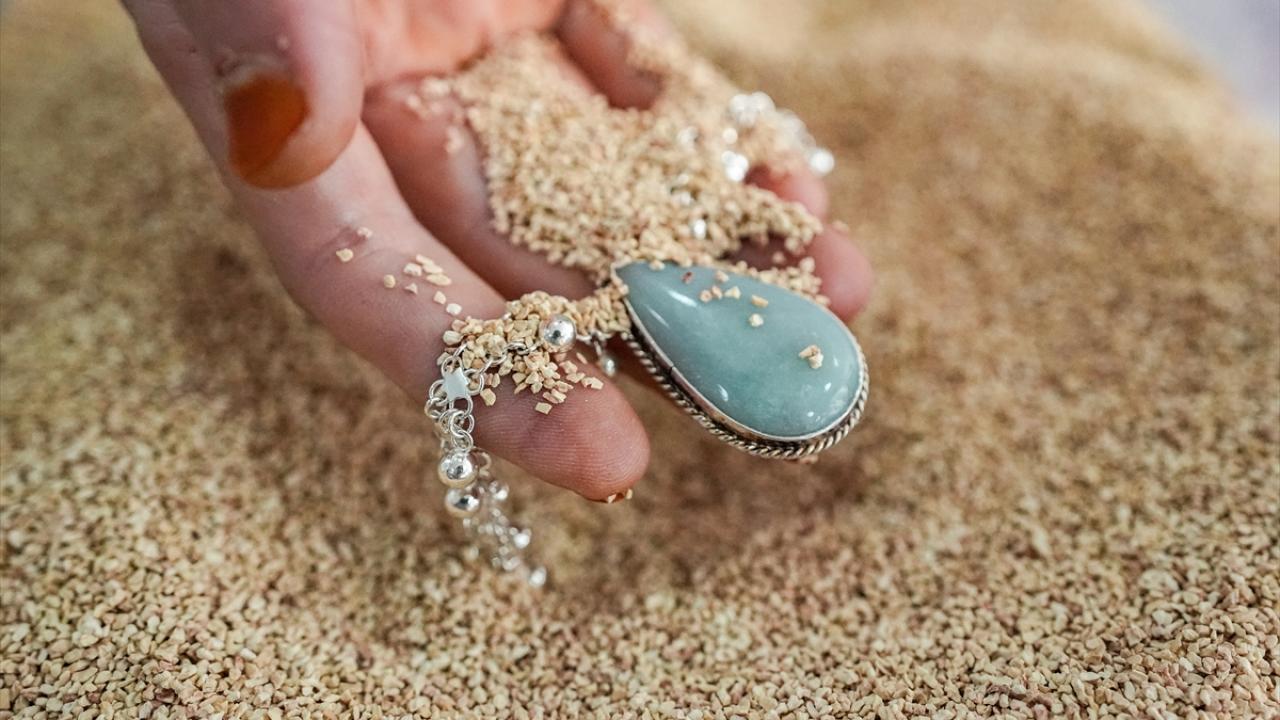 Bu taşlardan birinin de "kalsedon taşı" olduğunu belirten Aydoğan, topladıkları taşları atölyeye getirdiklerini ve burada takı ve aksesuarlara göre damla, oval gibi farklı şekillerde işleyip değerlendirdiklerini anlattı. Aydoğan, şunları kaydetti: