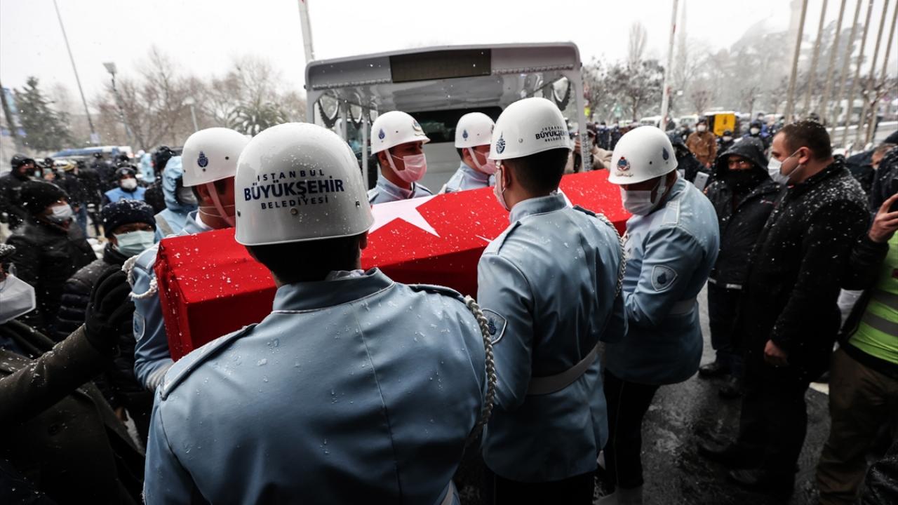 Topbaş`ın Türk bayrağına sarılı cenazesi, daha sonra İstanbul Büyükşehir Belediyesi zabıta ekiplerinin omuzlarında Fatih Camii’ne getirildi.