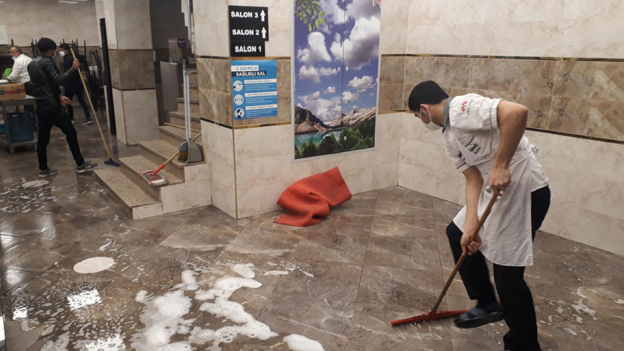 Küçükçekmece`de bir lokantada temizlik çalışması yapıldı, masa ve sandalyeler tekrar eski haline getirilerek yerlerine yerleştirildi.