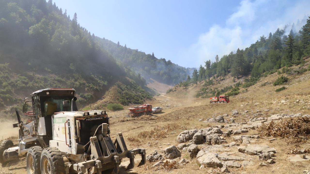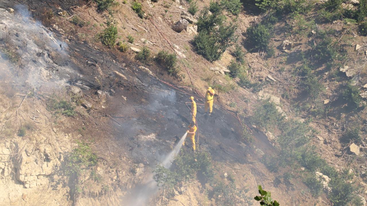 Ekipler, sarp ve kayalık bölgedeki yangını kontrol altına alabilmek için çalışmalarını sürdürüyor.
