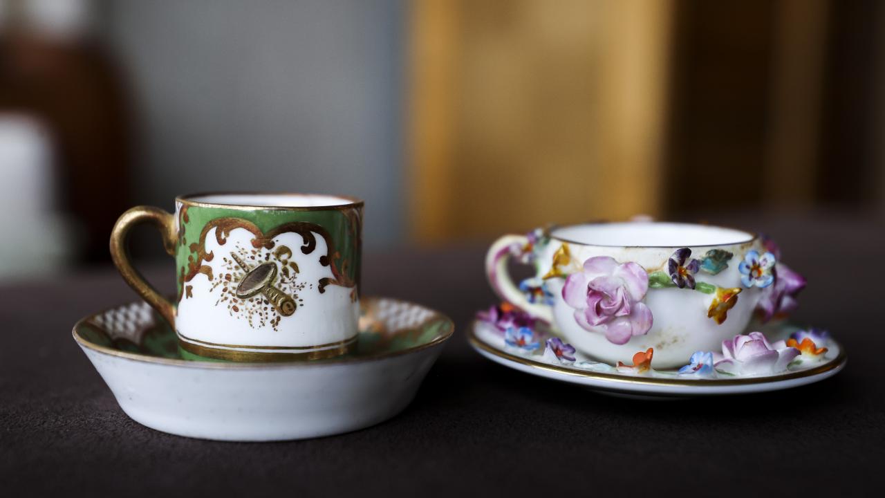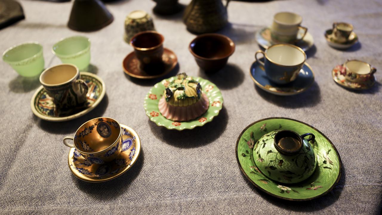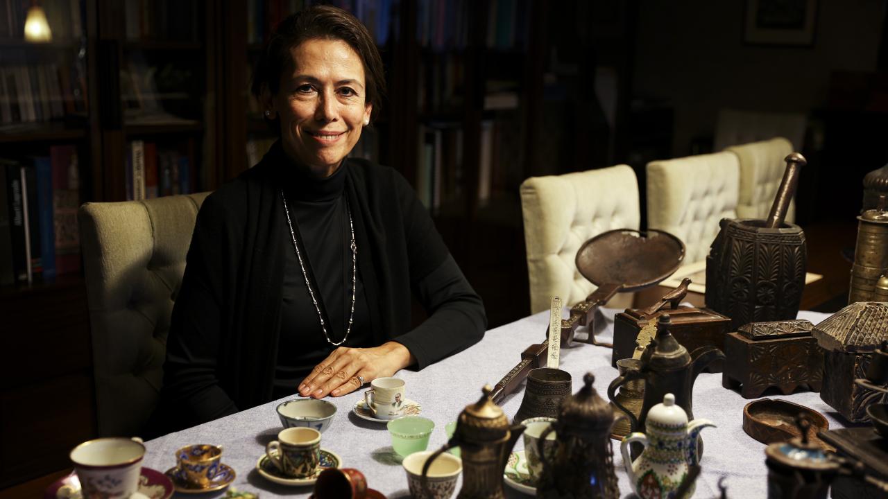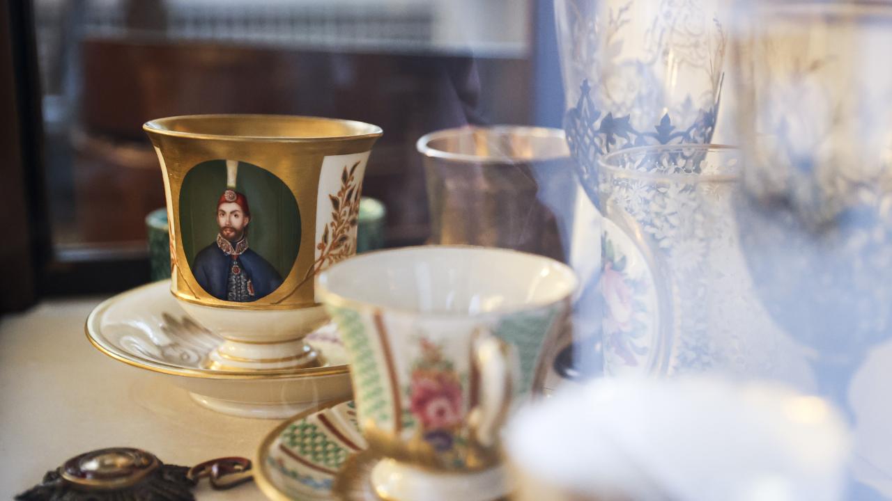 Nihal Bursa, koleksiyonundaki parçaların hepsinin ayrı bir alınış hikayesi ve macerası olduğunun altını çizerek, "Mesela bu fincan 1734 tarihlidir ve `Meissen` imalatıdır. Bir başka örnek bu kulpsuz fincan, içinde çok şey gizli. İçindeki gümüş telkari tekniğiyle yapılmış kapsül açılıyor. İçerisine amber, kakule ya da afyon gibi keyif ve lezzet arttırıcı ürünler konuluyor. Üzerine de kahve dökülüyor. Kahve içerken bütün bu malzemeler yavaş yavaş kahvenin içerisine karışarak kahve keyfinizi artıran bir unsur haline geliyor. Buna güğüm diyoruz yani çok sayıda kahve alan bir araç. 1712 tarihli, çok eski. 2015`te Topkapı Sarayı`nda düzenlenen sergiye koleksiyonumuzdan eserler vermiştik, bu güğüm de saraya giden ve orada 6 ay sergilenen bir parçaydı. Onun benim için yeri ayrıdır, Topkapı Sarayı`nı görmüş bir parçadır" dedi