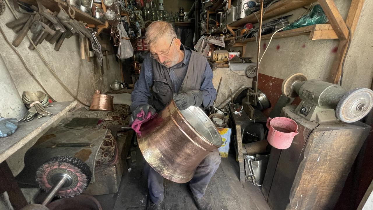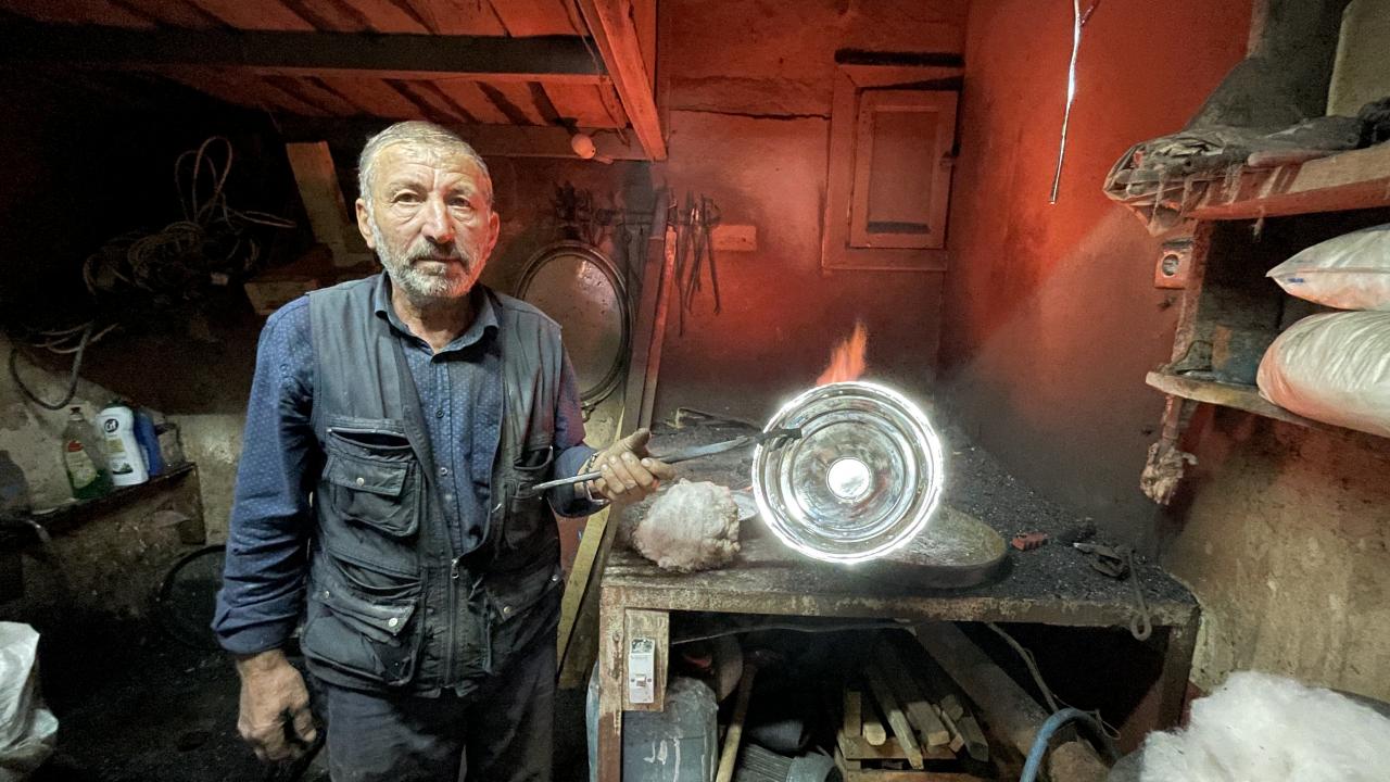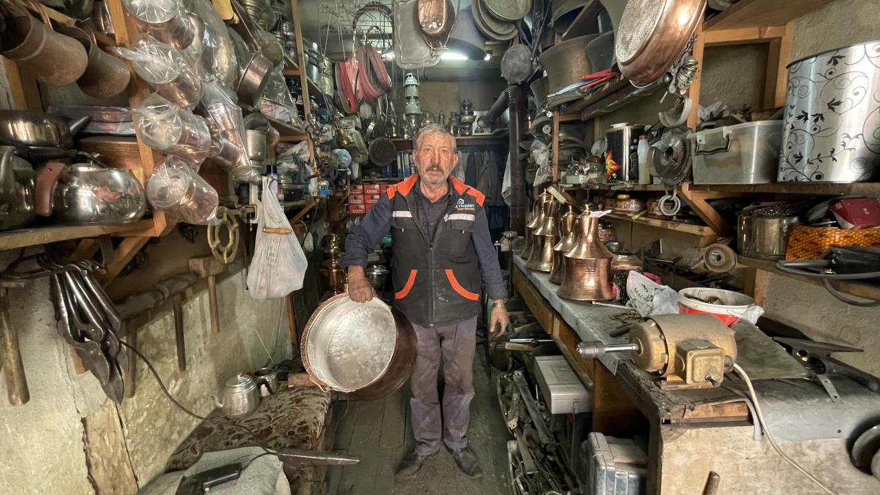 Mesleğini ilk günkü sevgiyle sürdüren Hanefi Sarıkaya, çırak olarak başladığı kalaycılıkta 54 yılı devirdiğini söyledi.