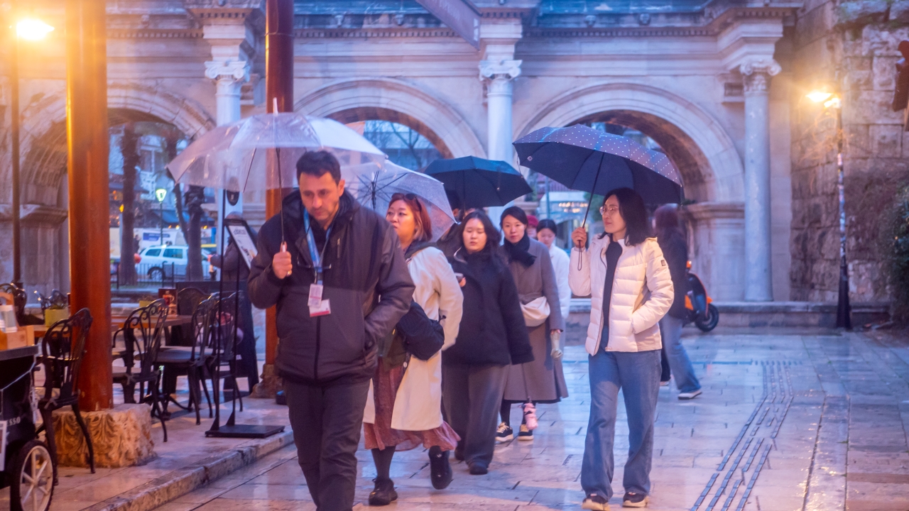 Yağmura rağmen neşelerini kaybetmeyen kafile ikili üçlü gruplar halinde Kaleiçi`nin dar sokaklarında yürüyüş yaptı önemli noktaları ziyaret etti.