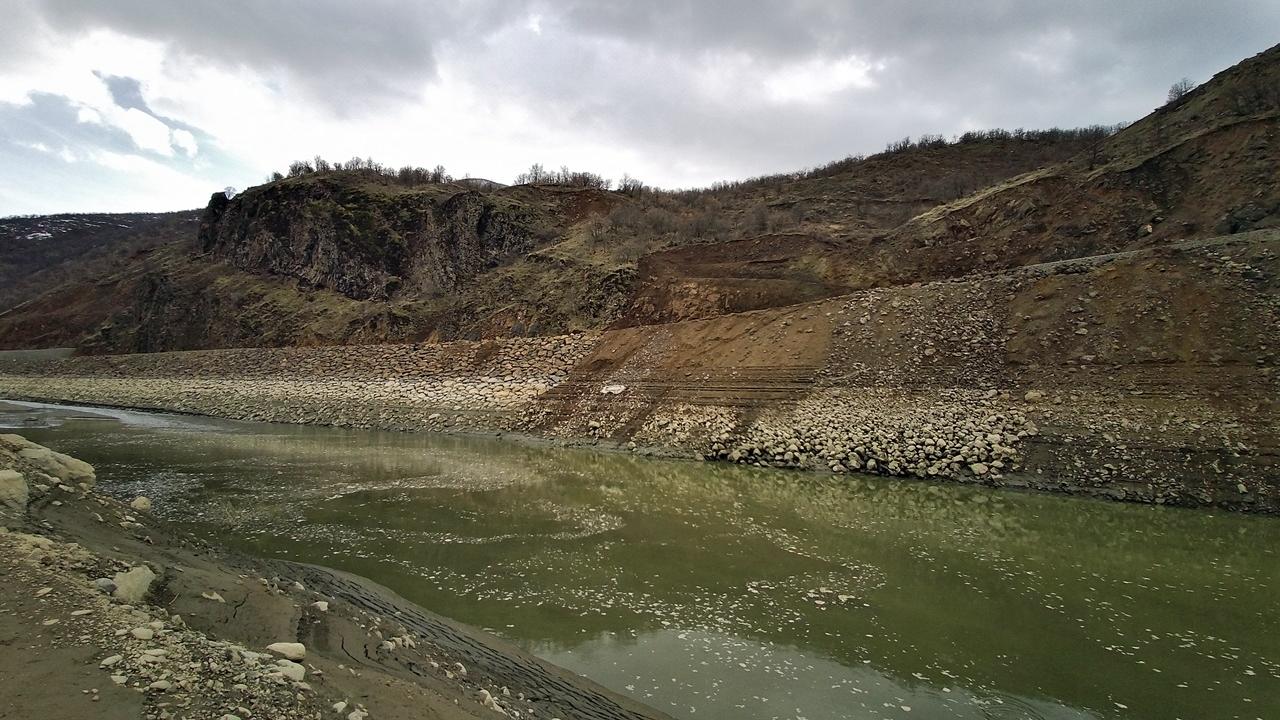 Bingöl'ün Genç ilçesine bağlı Yağızca köyü yakınlarındaki Kaleköy Baraj Gölü'nün su seviyesi 6 metre çekilince sular altında kalan yol ve köprü ortaya çıktı.