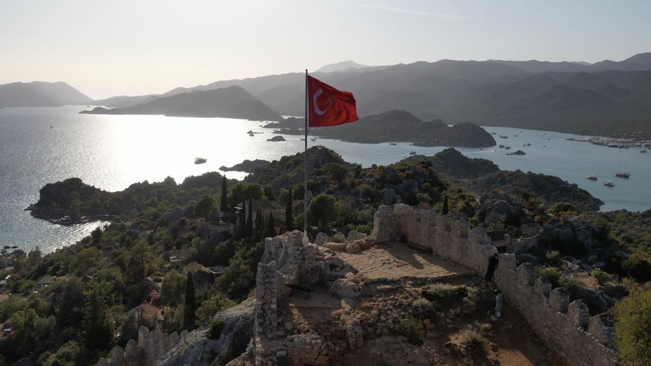 Antalya'nın Demre ilçesine bağlı Kekova Adası'ndaki Kaleköy'ün tarihi yapıları ve doğal güzellikler havadan görüntülendi.