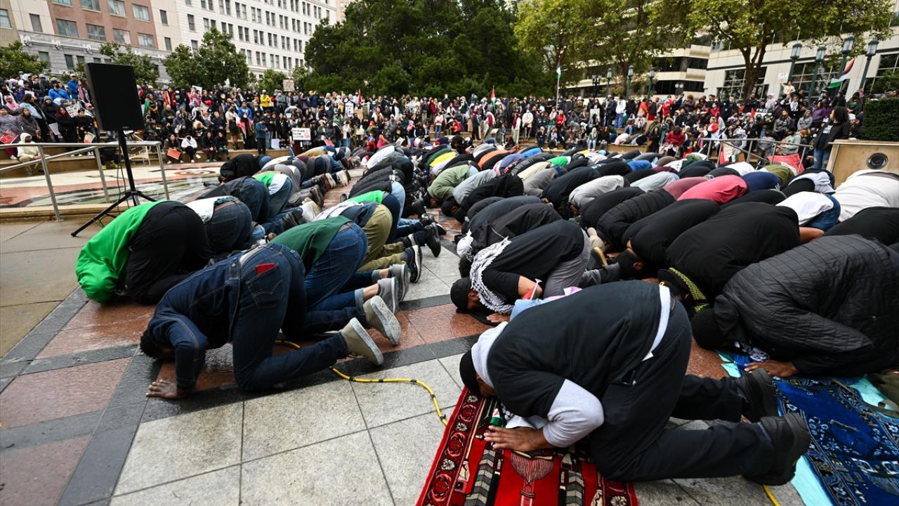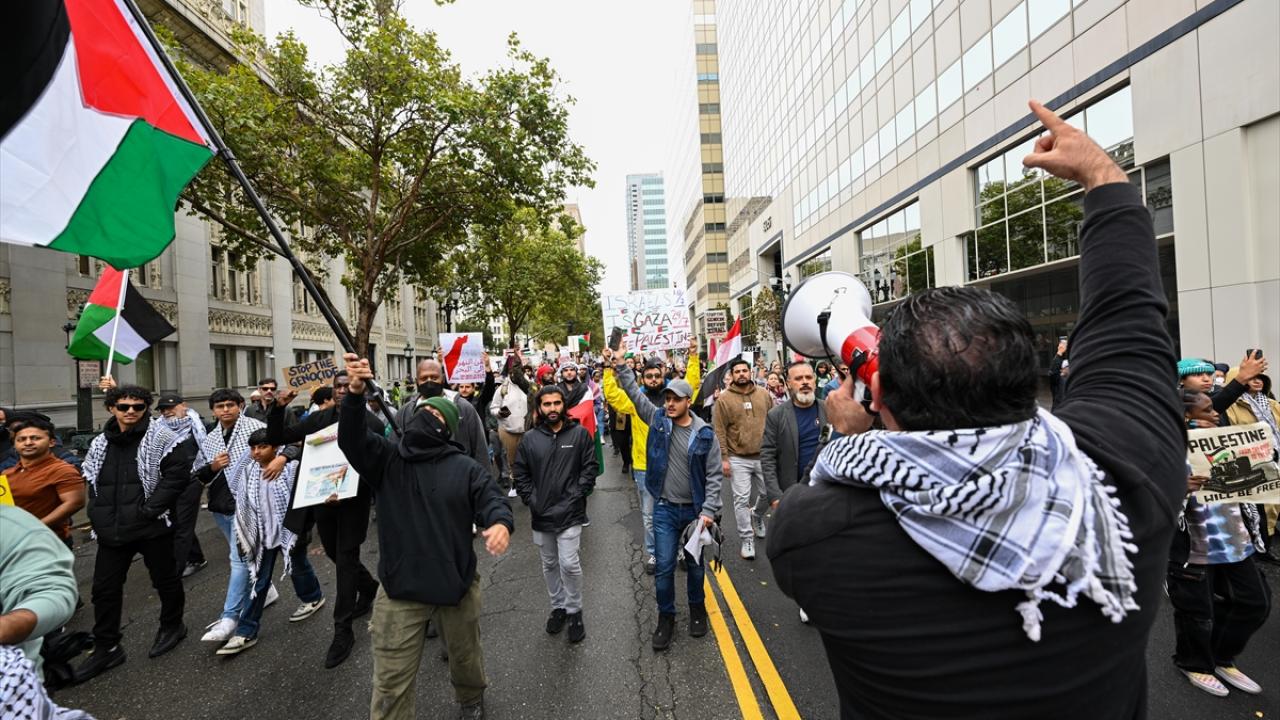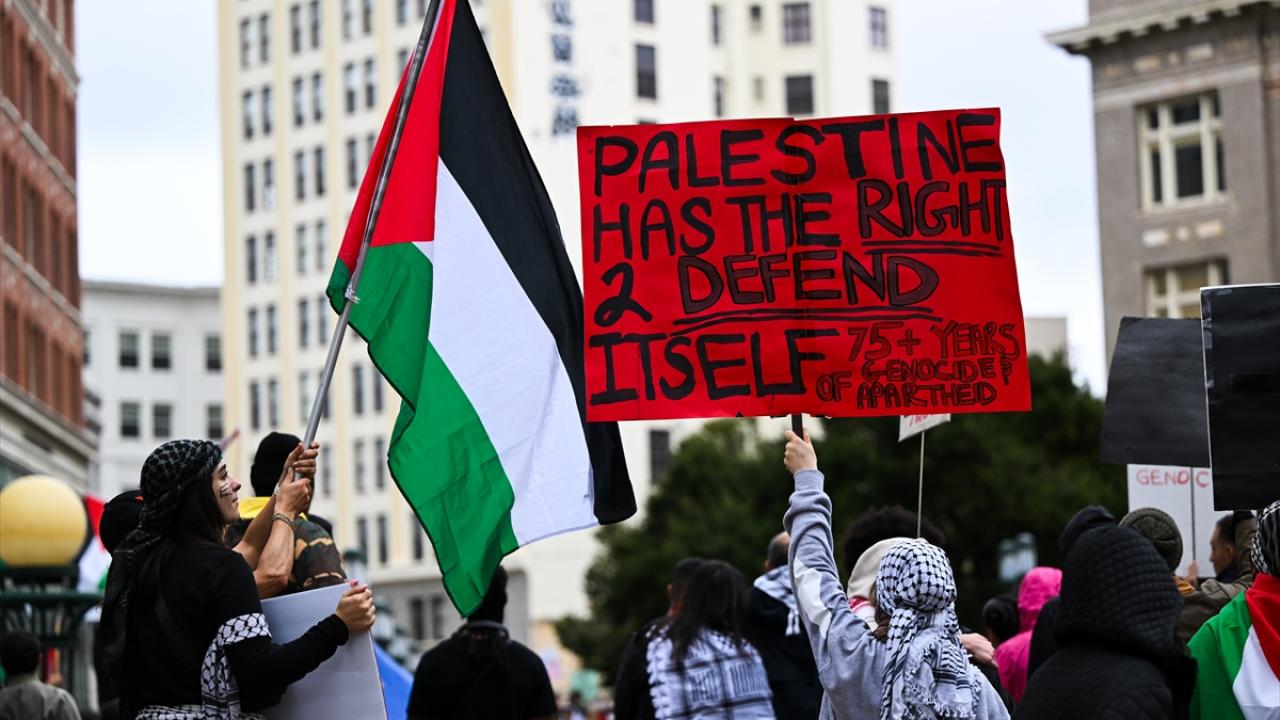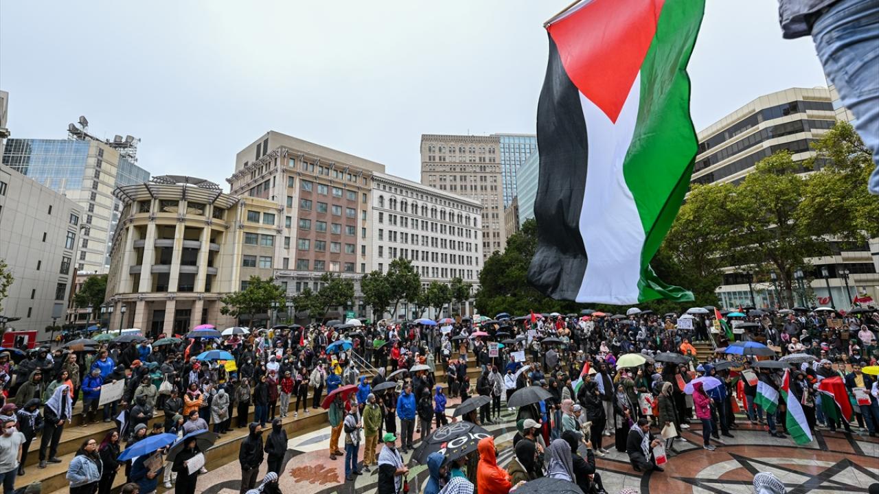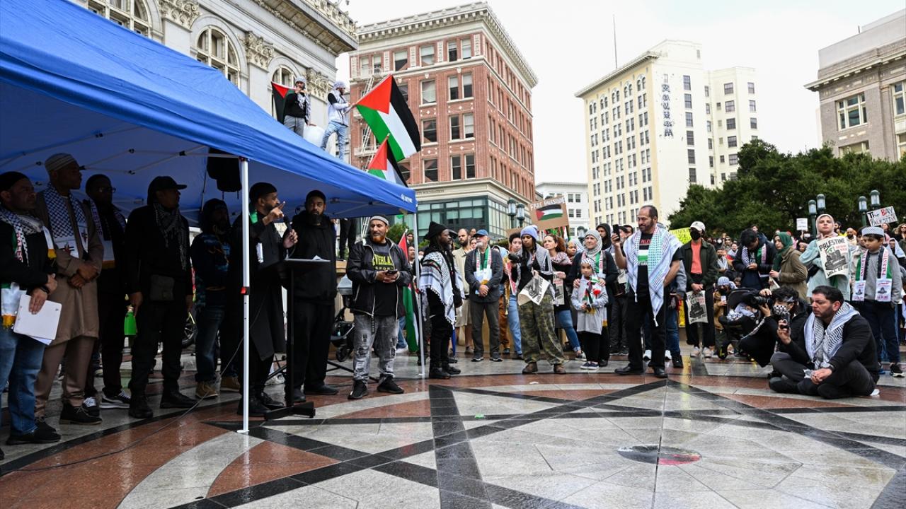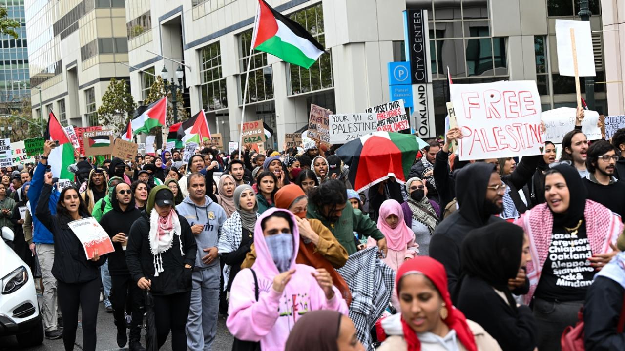 Amerika Birleşik Devletleri'nin Kaliforniya eyaletine bağlı Oakland kentinde yüzlerce kişi, Filistin'e destek vermek amacıyla belediye binası önünde bir araya geldi.