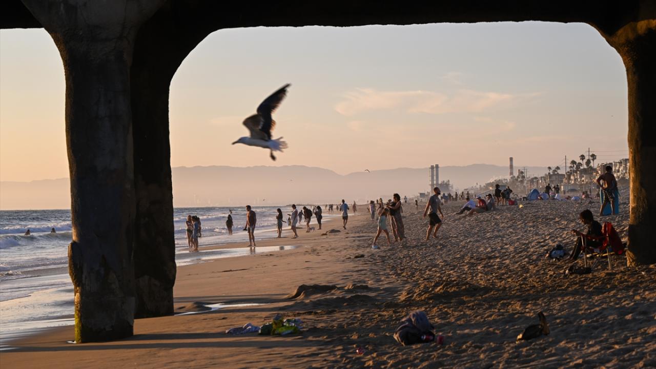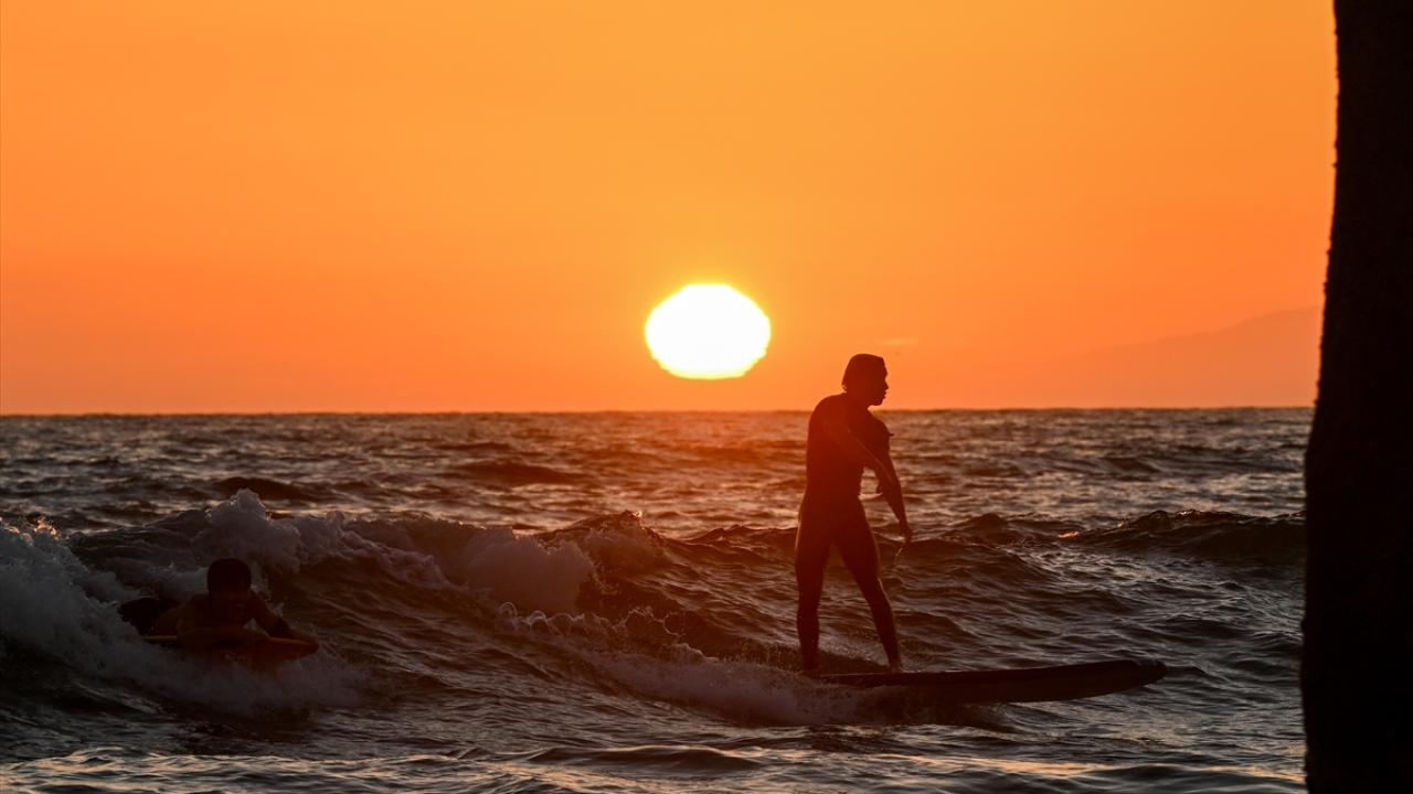 Manhattan Plajı`nda gün batımında sörf yapan insanlar görüntülendi.