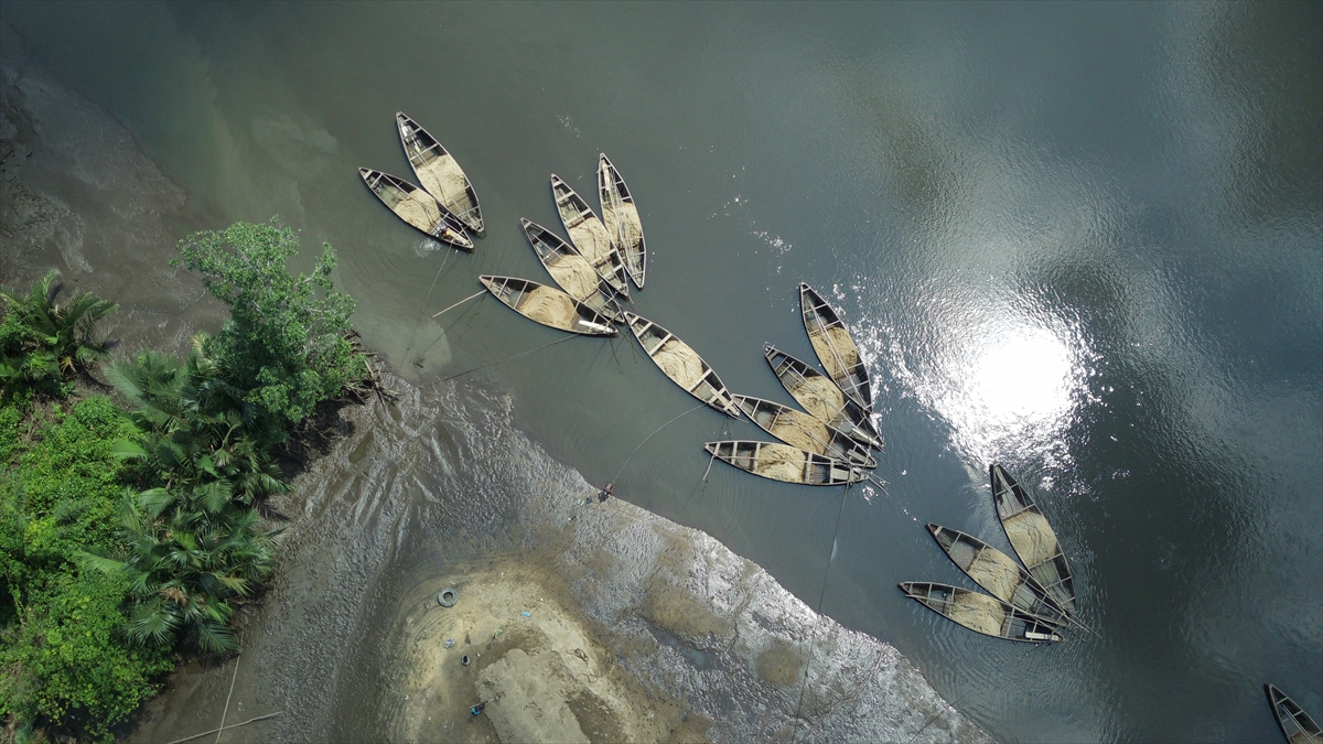 Kanolar kumlu bölgeye geldiğinde, ekibin yarısı suyun içine dalarak nehrin dibinden kum çıkartıyor ve kumlar, kovalarla kanolara konuluyor.