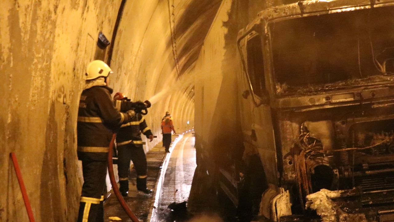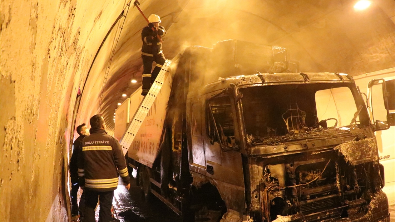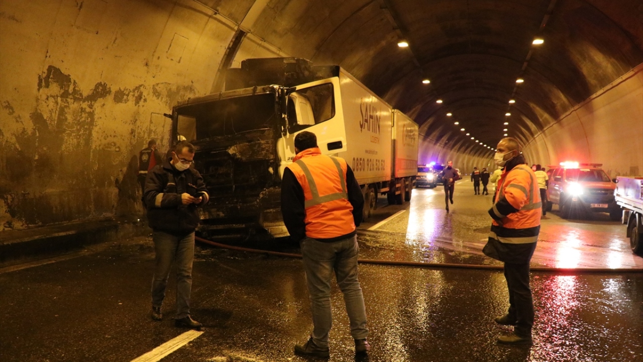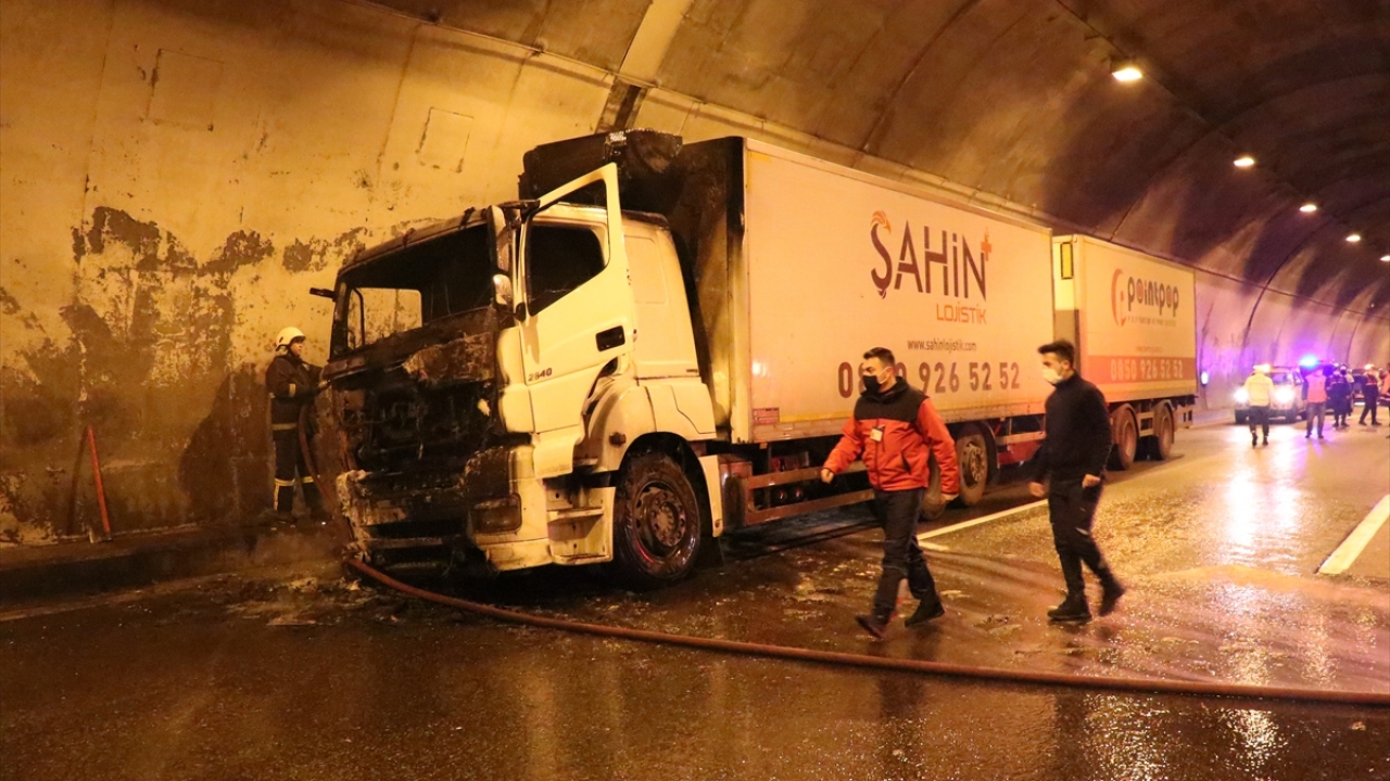 Kamyondan dumanlar yükseldiğini fark eden sürücü, aracını emniyet şeridine çekerek itfaiye ekiplerinden yardım istedi.