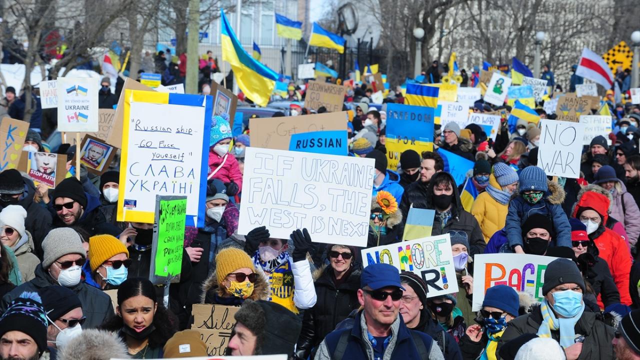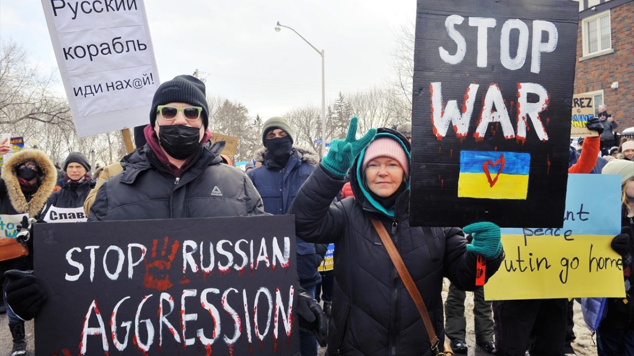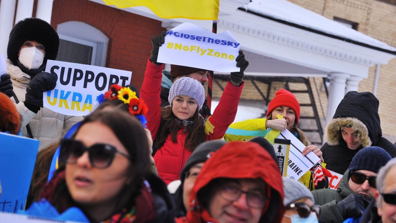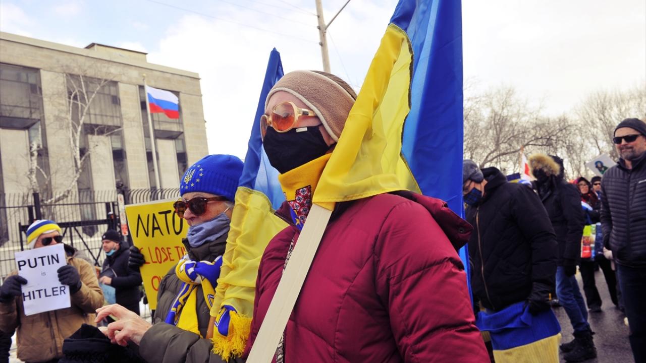 Ukrayna Büyükelçiliği çevresinde toplanan göstericiler, Ukrayna bayrakları taşıdı.
