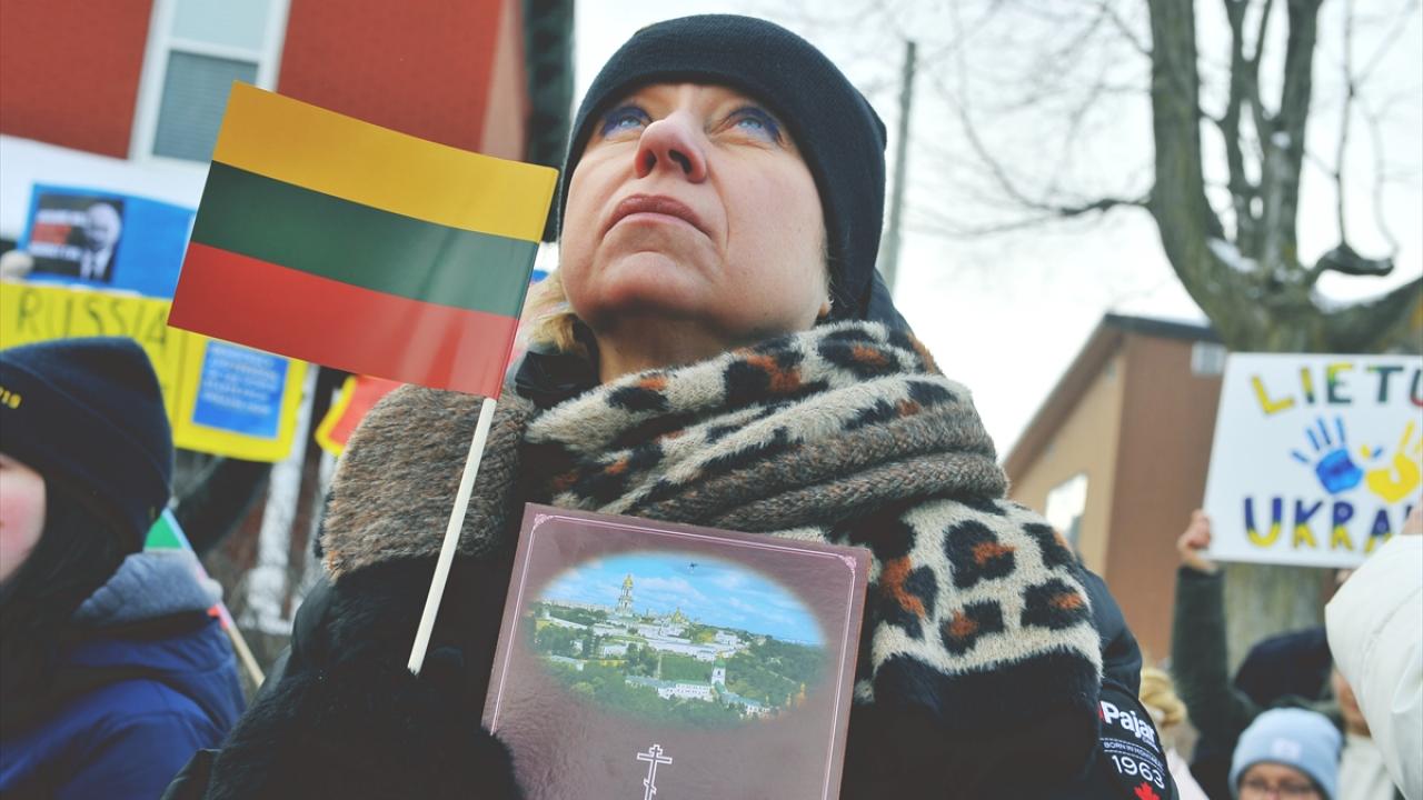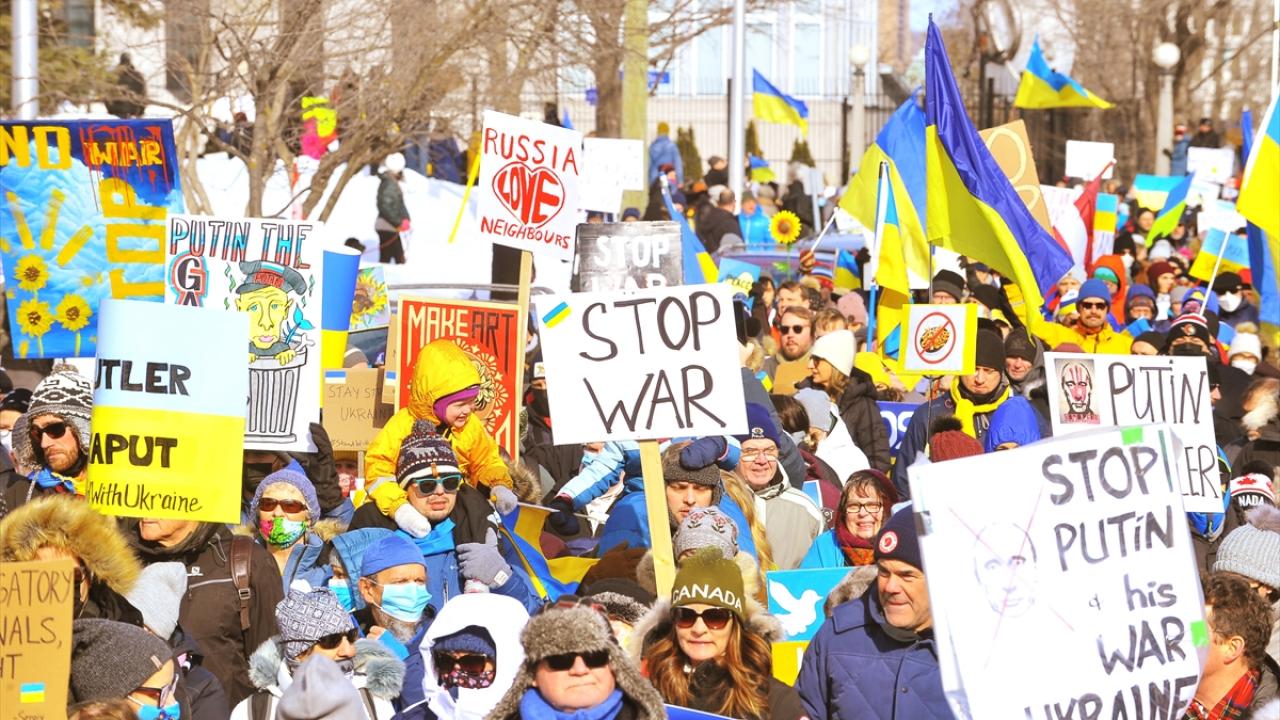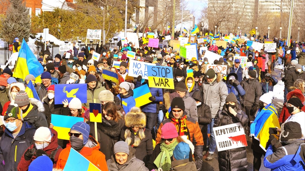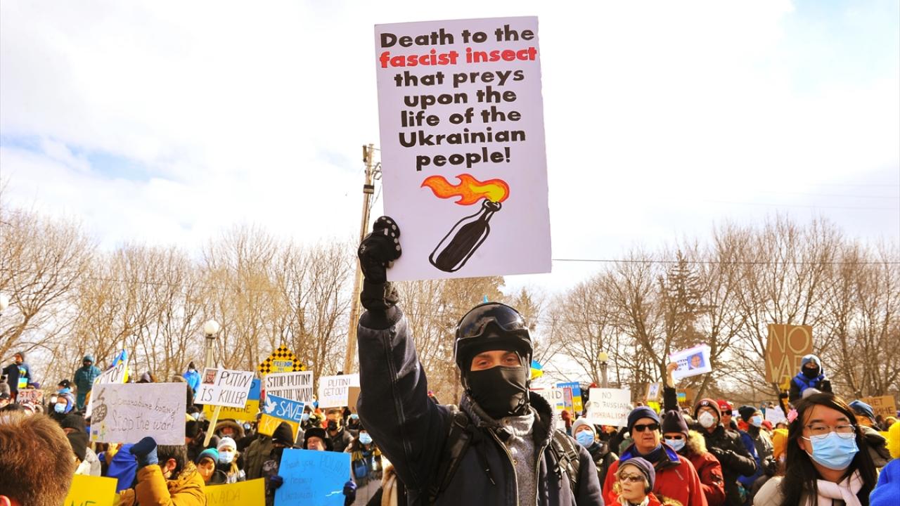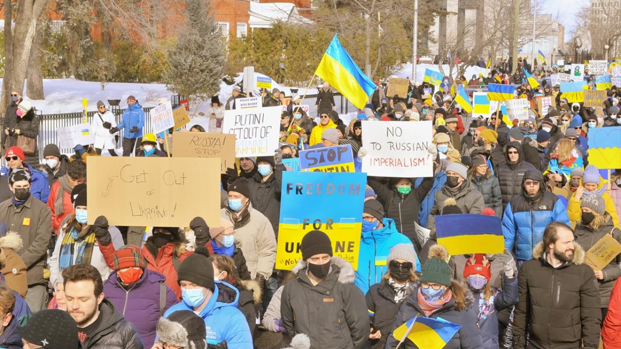 Ukrayna Büyükelçiliği çevresinde toplanan göstericiler, Ukrayna bayrakları taşıdı.
